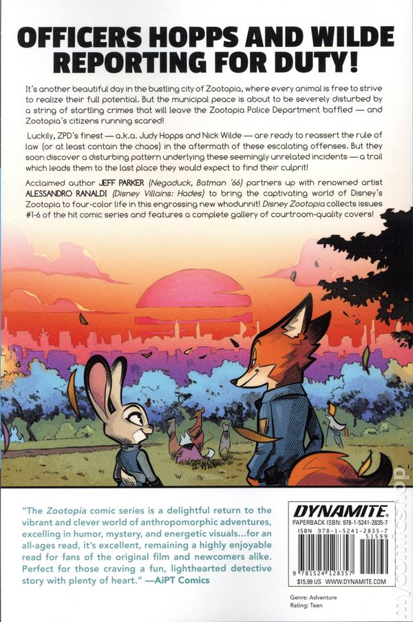 1st printing. Collects Zootopia (2025 Dynamite) #1-6. Written by Jeff Parker. Art and cover by Alessandro Ranaldi. OFFICERS HOPPS AND WILDE REPORTING FOR DUTY! Its another beautiful day in the bustling city of Zootopia, where every animal is free to strive to realize their full potential. But the municipal peace is about to be severely disturbed by a string of startling crimes that will leave the Zootopia Police Department baffled — and Zootopias citizens running scared! Luckily, ZPDs finest — a.k.a. Judy Hopps and Nick Wilde — are ready to reassert the rule of law (or at least contain the chaos) in the aftermath of these escalating offenses. But they soon discover a disturbing pattern underlying these seemingly unrelated incidents — a trail which leads them to the last place they would expect to find their culprit! Acclaimed author JEFF PARKER (Negaduck, Batman 66) partners up with renowned artist ALESSANDRO RANALDI (Disney Villains: Hades) to bring the captivating world of Disneys Zootopia to four-color life in this engrossing new whodunnit! Zootopia collects issues #1-6 of the hit series and features a complete gallery of courtroom-quality covers! Softcover, 6-in. x 9-in., 160 pages, full color. Teen Cover price $15.99.