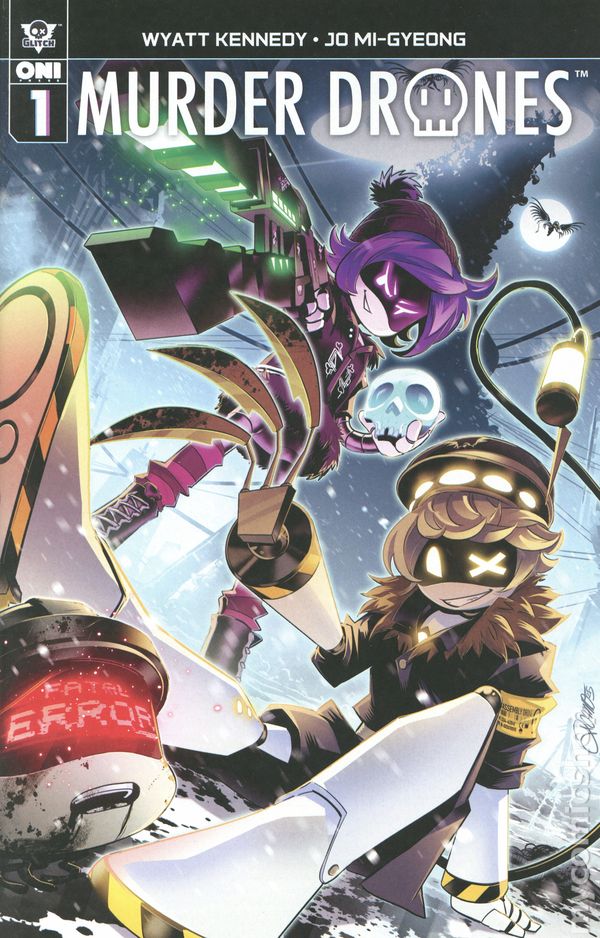 Limited 1 for 20 Retailer Incentive Variant Cover. (W) Wyatt Kennedy (A) Jo Mi-Gyeong (CA) Krooked Glasses Based on Glitch Productions' global animation phenomenon created by Liam Vickers and now streaming on Prime Video, it's three cheers for 'destroy all humans' as all-star creators Wyatt Kennedy (Nights, Marvel Voices) and Jo Mi-Gyeong (Eve, The Dark Crystal: Age of Resistance) unleash the record-setting comics adaptation of the series that you have watched 330 million times: MURDER DRONES! In the far future on the desolate exoplanet designated Copper 9, the humans are long gone but the robotic worker drones they created to mine the planet's resources are still hard at work. Together, they have managed to forge their own makeshift society . . . or so they thought until a previously unknown kind of robot—the dreaded 'Murder Drones'—are activated by a long-forgotten human-scripted protocol to disassemble any worker that deviates from its original programming. But when a rebellious young worker drone named Uzi forms an unlikely alliance with two disassembly drones—Serial Designations N and V—can they, together, uncover the secrets of their origins . . . and stop the spread of the unsettling mechanical virus known as the Absolute Solver? Robots, violence, teen angst, mad science, love, loss, doors, hormones, and chaos! What more could you ask for? A pen, perhaps? It's a clicky pen! (Ask your kids. They'll get it!) Cover price $4.99.