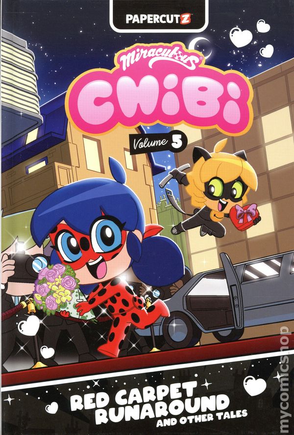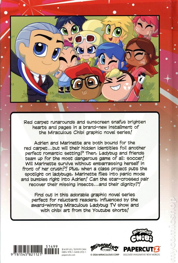 Volume 5 - 1st printing. "Red Carpet Runaround and Other Tales!" Written by Sarah Cooke, Carrie Harris, and Molly Jones. Art by Ryan Jampole, Lara Kessia, Sophie Scruggs, and Natalie Haines. Cover by Ryan Jampole. Back Cover by Natalie Haines. Red carpet runarounds and sunscreen snafus brighten hearts and pages in a brand-new installment of the Miraculous Chibi graphic novel series! Adrien and Marinette are both bound for the red carpet...but will their hidden identities foil another perfect romantic setting? Then, Ladybug and friends team up for the most dangerous game of all: soccer! Will Marinette survive without embarrassing herself in front of her crush?! Plus, when a class project puts the spotlight on ladybugs, Marinette flies into panic mode and bumbles right into Adrien! Can the star-crossed pair recover their missing insects...and their dignity?! Find out in this adorable graphic novel series perfect for reluctant readers, influenced by the award-winning Miraculous Ladybug TV show and with chibi art from the Youtube shorts! Hardcover, 6-in.x 9-in., 64 pages, full color. Cover price $14.99.