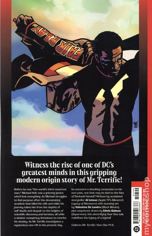 1st printing. Collects Mr. Terrific: Year One (2025 DC) #1-6. Written by Al Letson. Art by Valentine De Landro and Edwin Galmon. Cover by Valentine De Landro. FROM TRAGEDY TO TRIUMPH, WITNESS THE RISE OF ONE OF DC'S GREATEST MINDS IN THIS GRIPPING MODERN ORIGIN STORY OF MR. TERRIFIC! Before he donned the T-mask, Michael Holt was a grieving genius who'd lost everything. As Michael struggles to find purpose after a devastating tragedy, his journey from despair to heroism takes him from the depths of isolation and selfdoubt to the heights of scientific discovery, all while a sinister conspiracy sets off an explosive chain of events that will rewrite his destiny forever! Written by acclaimed storyteller Al Letson (Monarch: Legacy of Monsters) with stunning art by Valentine De Landro (Black Manta), plus present-day sequences drawn by Edwin Galmon (Superman), this electrifying Year One tale redefines the legacy of a legend! Softcover, 144 pages, full color. Teen Cover price $17.99.