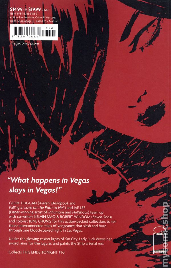 1st printing. Collects This Ends Tonight (2025 Image) #1-3. Written by Gerry Duggan, Kelvin Mao, and Robert Windom. Cover and Art by Jae Lee.`THIS ENDS TONIGHT presents three intertwining tales of revenge that tears through Las Vegas on a single action-packed night. Sin City has about 250 murder victims sent to the morgue every year -- these three tales eclipse that in just a few hours with guns, knives, swords, poison, a spike strip and vehicular mayhem. THIS ENDS TONIGHT! GERRY DUGGAN (X-Men & Deadpool) and JAE LEE (Eisner-winning artist of Inhumans and Hellshock) team up with co-writers KELVIN MAO and ROBERT WINDOM and colorist JUNE CHUNG. Softcover, 104 pages, full color. Teen+ Cover price $14.99.