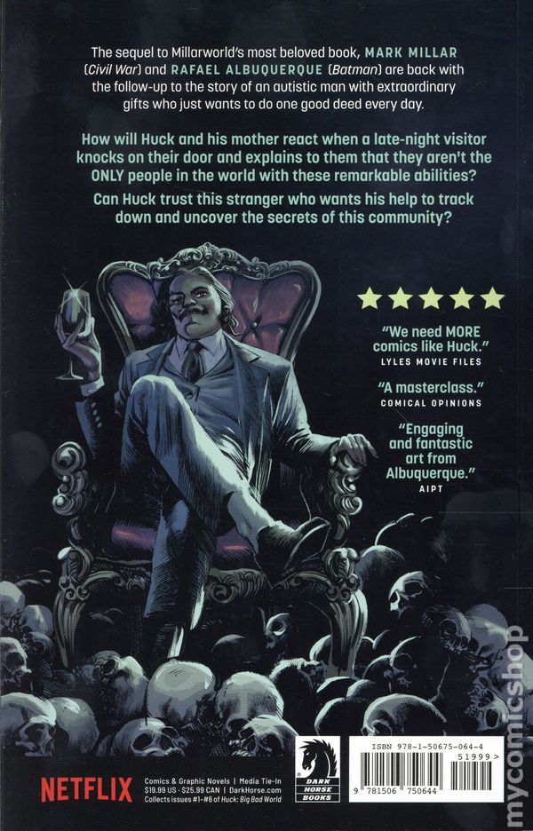 Volume 2 - 1st printing. "Big Bad World!" Collects Huck: Big Bad World (2025 Dark Horse) #1-6. Written by Mark Millar. Art and Cover by Rafael Albuquerque. A man who just wants to make your day, coming up against the real world and hoping to change it. Huck is the ultimate feel-good graphic novel, and this is a must for anyone who needs a little dopamine hit. The sequel to Millarworlds most beloved graphic novel, Millar and Albuquerque are back with the follow-up to the story of an autistic man with extraordinary gifts, who just wants to do one good deed every day and play his small part in making the world a better place. In this story he discovers there are other people like him around the world, but theyre in danger and hiding from the authorities who know the secret behind their gifts, and who want to secure their power over them. The return of a heartwarming, feel-good superhero! Softcover, 168 pages, full color. Cover price $19.99.