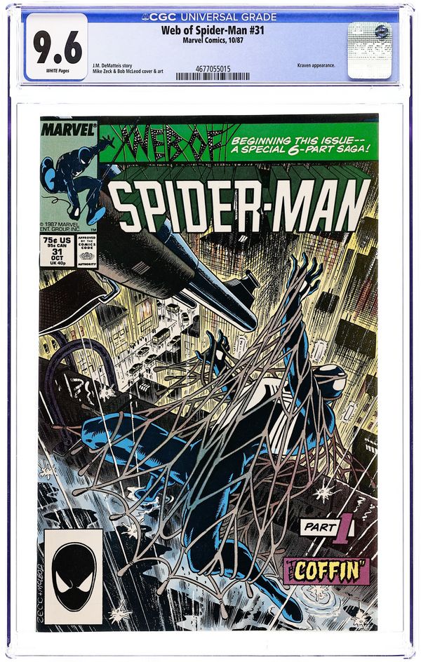 Direct Edition. Kraven's Last Hunt: Part 2 of 6 -- "Crawling" Script by J.M. DeMatteis. Pencils by Mike Zeck. Inks by Bob McLeod. Cover by Mike Zeck and Bob McLeod. Story continues from Web of Spider-Man 31. In a shocking development, Kraven the Hunter has buried the Amazing Spider-Man six feet under! And now the deranged hunter is wearing his own spider costume and fighting crime on the streets of New York City! Unbelievable! What in the world is going on?! That's what Mary Jane would like to know as she desperately searches for her newlywed husband! And to make matters worse, there's something horrific coming up from the sewers: Vermin! Story continues in Spectacular Spider-Man 131. (Note: Vermin previously appeared in Marvel Team-Up 128.) 36 pages. Cover price $0.75.