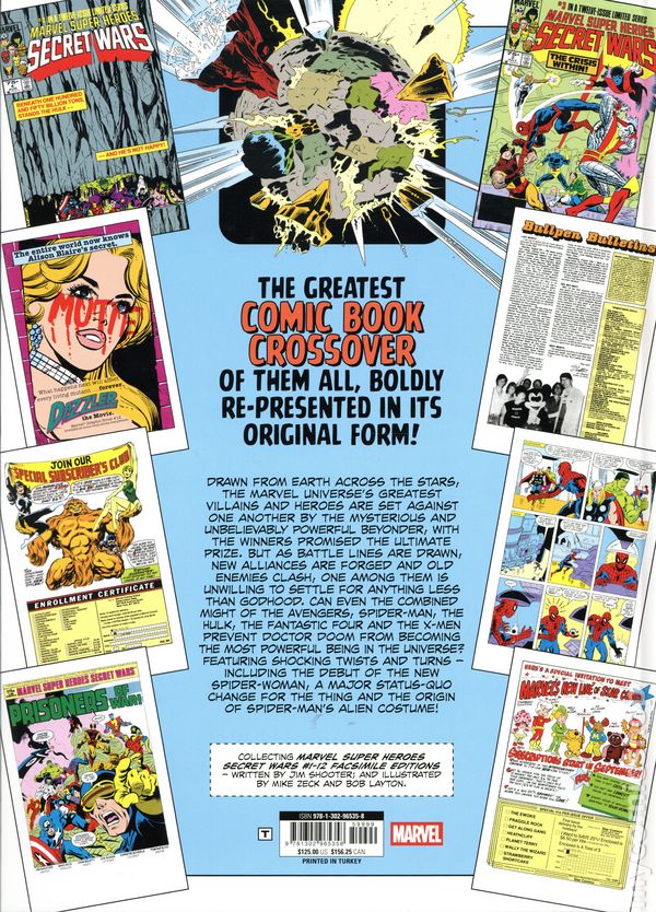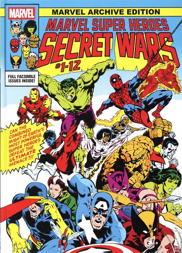 1st printing. Collects Marvel Super Heroes Secret Wars (1984) Facsimile Edition #1-12. Written by Jim Shooter. Art by Mike Zeck, Bob Layton, Jack Abel, John Esposito & Co. Cover by Mike Zeck. Introduction by Ralp h Macchio. THE GREATEST CROSSOVER OF THEM ALL, BOLDLY RE-PRESENTED IN ITS ORIGINAL FORM, ADS AND ALL! Drawn from Earth across the stars, the Marvel Universe's greatest villains and heroes are set against one another by the mysterious and unbelievably powerful Beyonder, with the winners promised the ultimate prize. But as battle lines are drawn, new alliances are forged and old enemies clash, one among them is unwilling to settle for anything less than godhood. Can even the combined might of the Avengers, Spider-Man, the Hulk, the Fantastic Four and the X-Men prevent Doctor Doom from becoming the most powerful being in the universe? Featuring shocking twists and turns - including the debut of the new Spider-Woman, a major status-quo change for the Thing and the origin of Spider-Man's alien costume! Hardcover, 9 1/2-in.x 13-in., 512 pages, full color. Rated T Cover price $125.00.