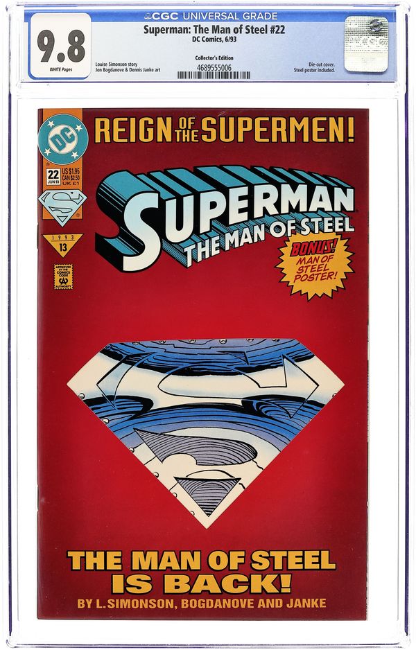 #22D special double cover of the Collector's Edition by Jon Bogdanove and Dennis Janke features a unique die-cut design on the outer cover. Beginning the 'Reign of the Supermen,' continued from Adventures of Superman (1939) #500. The Man of Steel returns to Metropolis to quell the latest crime wave in Suicide Slum led by a new, ruthless female crime lord, and Jeb is back in town to see Lois Lane in the wake of Clark Kent's disappearance. Bound into the center of this issue is a double-page miniposter of Superman, printed on cover stock. Written by Louise Simonson, with art by Jon Bogdanove and Dennis Janke. Cover price $1.95.