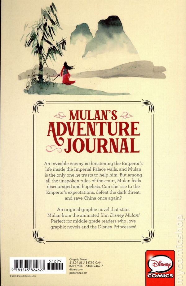 1st printing. Written by Rhona Cleary. Art by Agnese Innocente, Gaia Cardinali, and Ilaria Urbinati. Cover by Paulina Ganucheau. Back Cover by Ilaria Urbinati. An invisible enemy is threatening the Emperors life inside the Imperial Palace walls and Mulan is the only one he trusts to help him. But among all the unspoken rules of the court, Mulan feels discouraged and hopeless. Can she rise to the Emperors expectations, defeat the dark threat, and save China once again? An original graphic novel that stars Mulan from the animated film Disney Mulan! Perfect for middle-grade readers who love graphic novels and the Disney Princesses! Hardcover, 6 1/2-in. x 9-in., 96 pages, full color. Middle Grade Cover price $17.99.