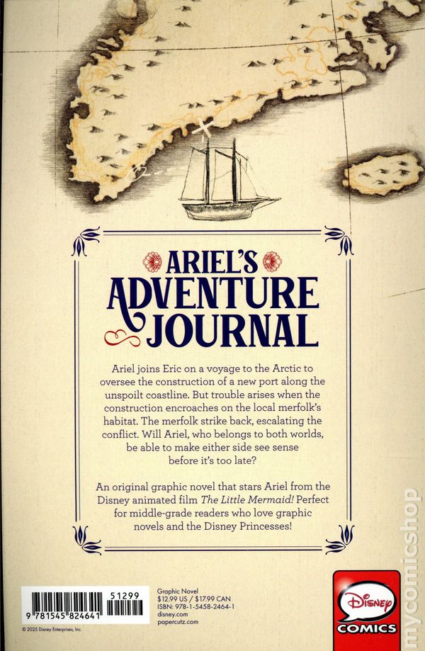 1st printing. Written by Rhona Cleary. Art by Valentina Brancati, Andrea Greppi, Lorenzo Fornaciari, and Marco Leoni. Cover by Valentina Brancati and Matteo Vattani. Back Cover by Marco Leoni. Ariel joins Eric on a voyage to the Arctic to oversee the construction of a new port along the unspoilt coastline. But trouble arises when the construction encroaches on the local merfolks habitat. The merfolk strike back, escalating the conflict. Will Ariel, who belongs to both worlds, be able to make either side see sense before its too late? An original graphic novel that stars Ariel from the animated film Disney The Little Mermaid! Perfect for middle-grade readers who love graphic novels and the Disney Princesses! Hardcover, 6 -in. x 9-in., 96 pages, full color. Middle Grade Cover price $17.99.