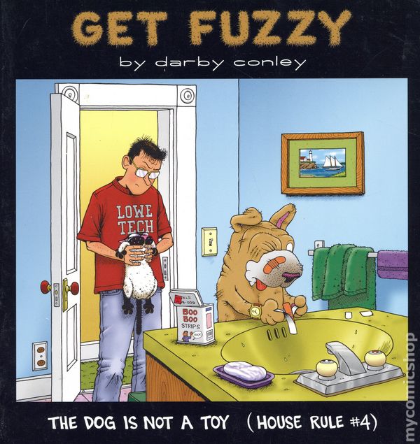 2nd and later printings. By Darby Conley. Get Fuzzy makes the fur fly. This freshly amusing strip is a darling among readers who enjoy pets with an attitude. This wry cartoon features Rob Wilco, a mild-mannered ad guy who's guardian to two rambunctious pets: Bucky, a temperamental cat who carries a boom box and goes on spending sprees, and Satchel, a gentle canine who tries to remain neutral even when he bears the brunt of Bucky's mischief. Together, this unlikely trio hangs out together, watching TV, cooking for friends, and attempting the occasional adventure outside. Anyone who has a pet or even knows one will find this Get Fuzzy collection, The Dog is Not a Toy, an astutely witty take on relationships between the species. Softcover, 8-in. x 9-in., 128 pages, PC/PB&W. Cover price $10.99.