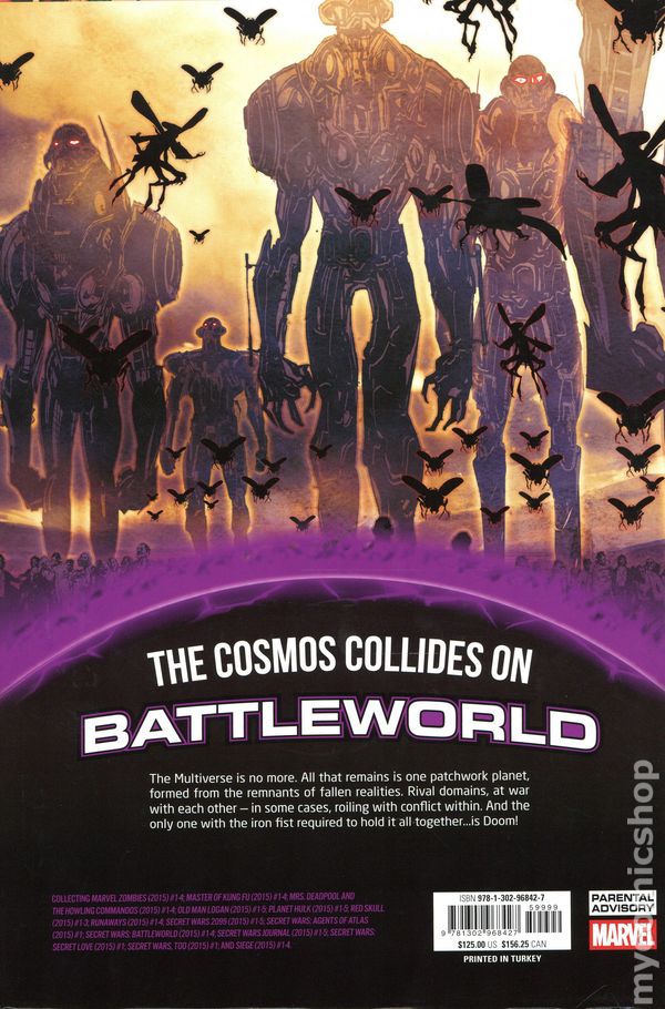 The interdimensional Incursions have eliminated each and every alternate universe one by one. And now - despite the best efforts of the scientists, sages and superhumans - the Marvel Universe and Ultimate Universe have collided...and been destroyed! All that exists in the vast empty cosmos is a single, titanic patchwork planet made of the fragmented remains of hundreds of devastated dimensions: Battleworld! And the survivors of this multiversal catastrophe all bend their knee to Battleworld's master: Doctor Doom!