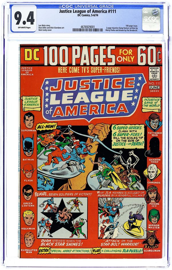 100-page giant issue. Cover art by Nick Cardy. Balance of Power!, script by Len Wein, pencils by Dick Dillin, inks by Dick Giordano. Wanted: the Injustice Gang!, script by Martin Pasko, art by Pat Broderick. The Black Star Shines! starring the Seven Soldiers of Victory, script by Mort Weisinger, art by Jon Smalle. Mystery of the Clowning Criminals starring the Shining Knight, art by Jon Smalle. Mystery of the Santa Claus Pirate! starring the Star Spangled Kid, art by Hal Sherman. Mystery of the One-Man Museum starring Green Arrow, script by Mort Weisinger, art by George Papp. Attack of the Star-Bolt Warrior! starring Justice League of America, script by Gardner Fox, pencils by Mike Sekowsky, inks by Bernard Sachs. 100 pgs. $0.60. Cover price $0.60.