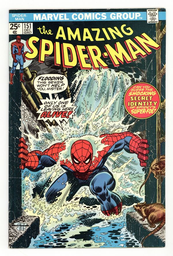 Ends Dec 8 7:18 PM CST Bid History 7 bids Current Bid $20 Your Secret Max Bid If you'd like to bid, please log in or register. "Skirmish Beneath the Streets!" Part 1 of 2. Script by Len Wein. Pencils by Ross Andru. Inks by John Romita Sr., Mike Esposito, Frank Giacoia, and Dave Hunt (backgrounds). Cover by John Romita Sr. One of the best Spider-Man covers of the bronze age kicks off a new era for the wondrous wall-crawler! And JJJ begins the fun by hosting a party in honor of Ned and Betty's engagement! The flattop curmudgeon is in rare form and about to make a speech when the lights suddenly go out! What happened to the NYC power grid? Maybe it was a shock(er) to the system! The web-slinger descends into the sewers to find out! Appearances by Mary Jane Watson, Flash Thompson, Harry Osborn, Betty Brant, Ned Leeds, J. Jonah Jameson, and Joe Robertson. (Notes: In this issue Spider-Man disposes of his clone's body at the Brooklyn incinerating plant before attending Jonah's party. Thus, ending the saga of the Spider-Clone. Or so Spidey and all his fans thought. The Shocker previously appeared in Amazing Spider-Man 72. The cover to this issue is a homage to the classic cover of Amazing Spider-Man 33. Len Wein begins his memorable two-and-a-half year run as the writer of the Amazing Spider-Man title. This story was reprinted in Marvel Tales 128.) 36 pages. Cover price $0.25.