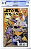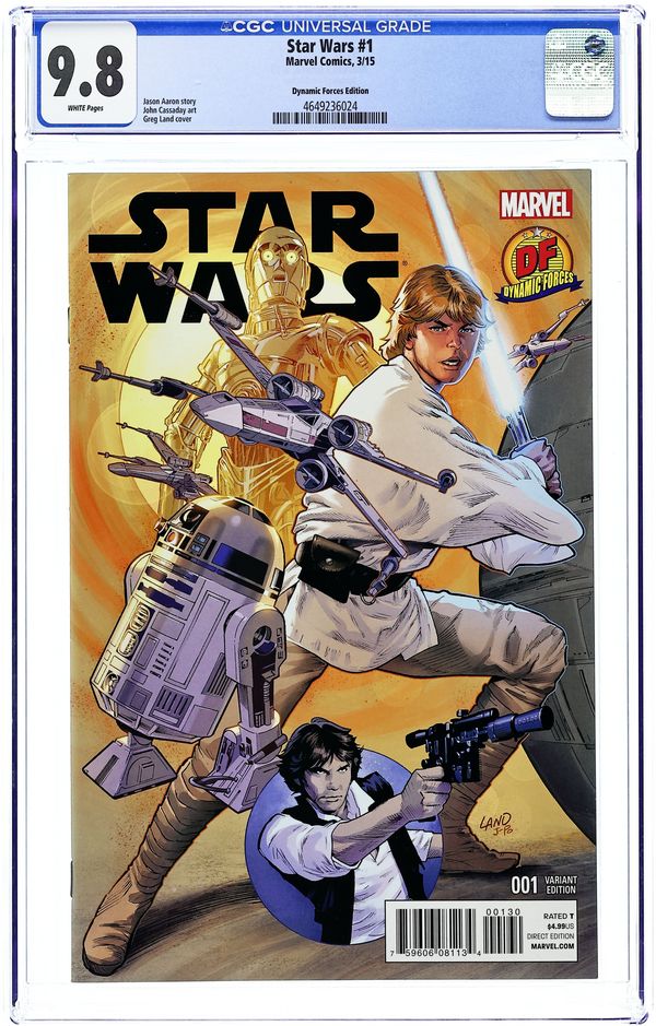Dynamic Forces Connecting Variant Cover by Greg Land, interlocks with Darth Vader #1 DF variant cover. Limited to 15,000 copies and includes a certificate of authenticity from Dynamic Forces. Written by Jason Aaron. Art by John Cassaday. THE GREATEST SPACE ADVENTURE OF ALL TIME RETURNS TO MARVEL! Luke Skywalker and the ragtag band of rebels fighting against the Galactic Empire are fresh off their biggest victory yet-the destruction of the massive battle station known as the Death Star. But the Empire's not toppled yet! Join Luke along with Princess Leia, smugglers Han Solo and Chewbacca, droids C-3PO and R2-D2 and the rest of the Rebel Alliance as they strike out for freedom against the evil forces of Darth Vader and his master, the Emperor. This is the Star Wars saga as only Marvel Comics could make it! 48 pages, full color. Rated T Cover price $4.99.