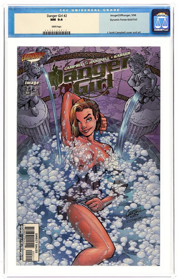 No DF logo on front; limited to 7,500 copies with Certificate of Authenticity. Cover pencils by J. Scott Campbell, inks by Alex Garner. "Dangerous Liaisons," script by J. Scott Campbell (plot) and Andy Hartnell (script), pencils by J. Scott Campbell, inks by Alex Garner and Scott Williams; Abbey Chase and her fellow Danger Girls lose The Peach as he and his minions escape; Abbey destroys a pair of helicopters in the process; The Danger Girls head for Interlaken, Switzerland after hitching a ride from a man we discover is Secret Agent Zero in disguise; Johnny Barracuda encounters Kid Dynamo; Abbey takes a bubble bath. Wildstorm Times ad. 36 pgs., full color.