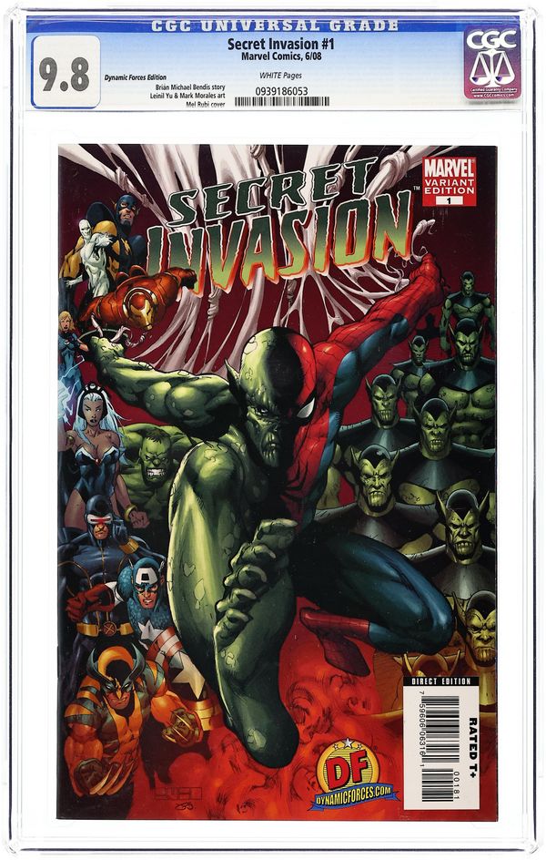 Dynamic Forces Exclusive Variant cover by Mel Rubi. Limited to 2500 copies. Includes Dynamic Forces Certificate of Authenticity. Written by BRIAN MICHAEL BENDIS Penciled by LEINIL FRANCIS YU. SECRET INVASION IS HERE!! Years in the making, months in the teasing...and it all STARTS HERE!! The shape-shifting alien race known as the Skrulls has secretly infiltrated every super-powered organization on Earth with one goal...full-scale invasion! In this DOUBLE-SIZED first issue, page after page unveils reveal after reveal and shocking moment after shocking moment! Brian Bendis and Leinil Francis Yu leap off the pages of mega-hit New Avengers and deliver a story that will change the Marvel Universe forever. THE MARVEL UNIVERSE WILL NEVER BE THE SAME!! 48 PGS./Rated T+