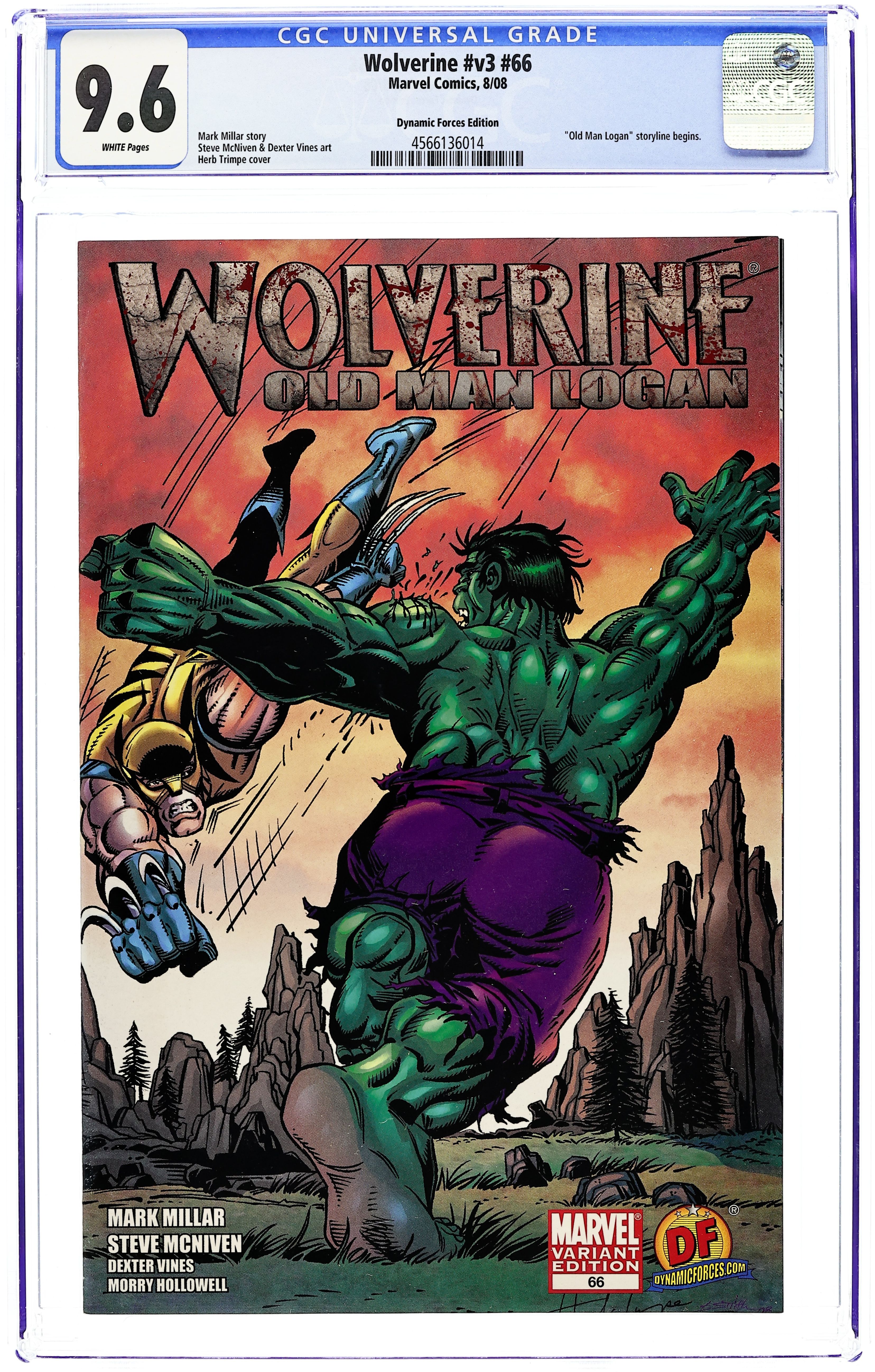 Dynamic Forces Variant cover by Herb Trimpe. Limited to 1999 copies. Includes Dynamic Forces Certificate of Authenticity. Old Man Logan: Part 1 of 8 - Written by MARK MILLAR Pencils by STEVE MCNIVEN. MARK MILLAR and STEVE MCNIVEN-who last teamed for the monumental CIVIL WAR-bring us the most important WOLVERINE story of the 21st Century. Nobody knows what happened on the night the heroes fell. All we know is that they disappeared and evil triumphed and the bad guys have been calling the shots ever since. What happened to Wolverine is the biggest mystery of all. For 50 years, no one has heard hide nor hair from him...and in his place stands an old man called Logan. A man concerned only about his family. A man pushed to the brink by the HULK GANG. A man forced to help an old friend-the blind archer, HAWKEYE-to drive three thousand miles to secure his family's safety. Get ready for the ride of your life, Logan. 32 PGS./Parental Advisory NOTE: This story plus Fantastic Four (1998- 3rd Series) #558-561 and Marvel 1985 (2008) #1-5 are all part of an epic past, present, and future storyline written by Mark Millar that all ties in together. - Odinson, Lone Star Comics Archivist