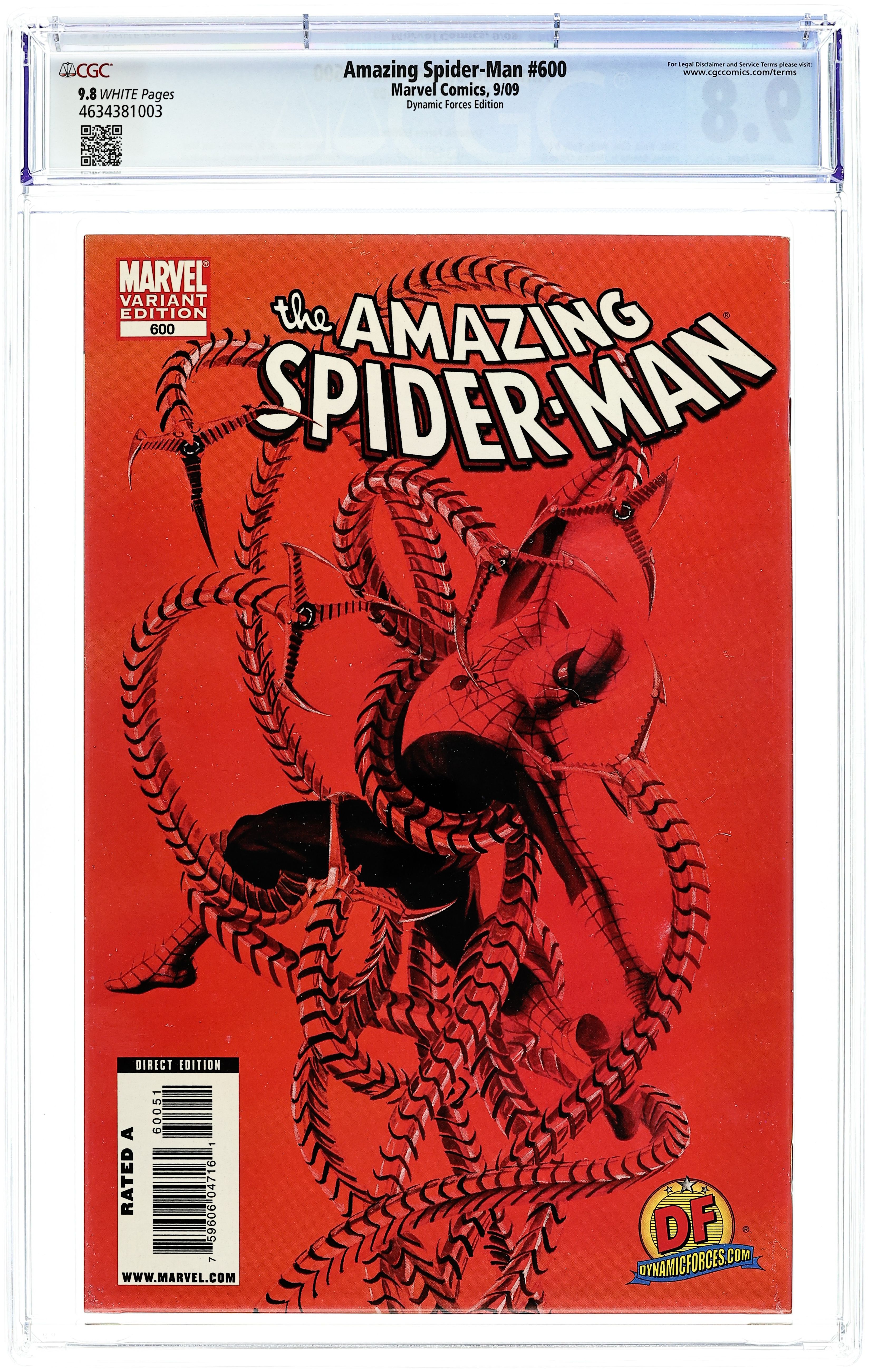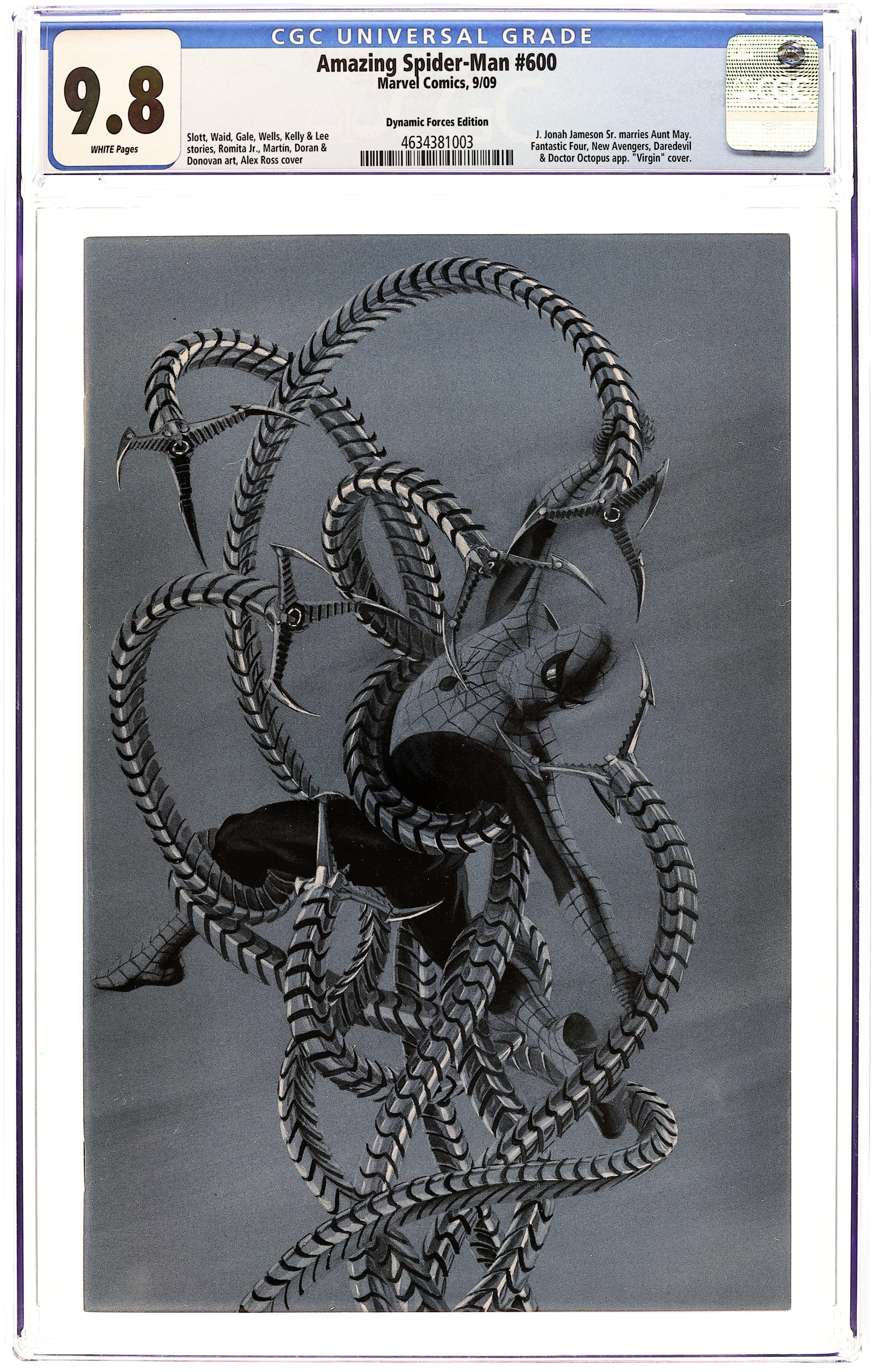 Dynamic Forces Exclusive Cover by ALEX ROSS. Limited to 3499 copies. Includes Dynamic Forces Certificate of Authenticity. Written by DAN SLOTT, STAN LEE, JOE KELLY, ZEB WELLS, BOB GALE, MARC GUGGENHEIM & MARK WAID. Art by JOHN ROMITA, JR., MARCOS MARTIN, MAX FIUMARA, DEREC DONOVAN (although some press for the issue had it as DEREC AUCOIN instead of DONOVAN), MARIO ALBERTI, COLLEEN DORAN, MITCH BREITWEISER & KLAUS JANSON. Plus, JEPH LOEB, ED BRUBAKER, MATT FRACTION, BRIAN MICHAEL BENDIS, MIKE McKONE, ANDY LANNING & JANSON give you the Spider-Man covers you'll never see! The greatest Marvel super hero of all celebrates his 600th issue with the biggest all-original issue of Amazing Spider-Man EVER! This one's got it all! The return of Doctor Octopus, Daredevil, a wedding you never predicted, and the return of one of the most important people in Peter Parker's life in a giant-sized lead story by Dan Slott and John Romita Jr. Doc's back in town, but it's only a prelude to darker days ahead as Spidey unknowingly prepares for a gauntlet he can't even see coming. On top of all that, witness the return of one of Spider-man's creators, Smilin' Stan Lee (along with Masticatin' Marcos Martin) as he presents a story of unbridled passion, drama and angst as Spidey reflects over his many, many years of adventures. But that ain't all...as the rest of the Spidey Web-Heads bring you several short features showcasing some rarely explored aspects of both Spidey and Pete's life, drawn by some of the greatest artists in comics. Plus, several other surprises and NO REPRINTS! 108 pages of goodness brought to you by some of the best creators that have ever worked on Spidey! 104 pages, full color.