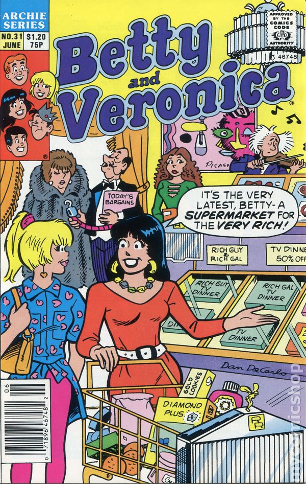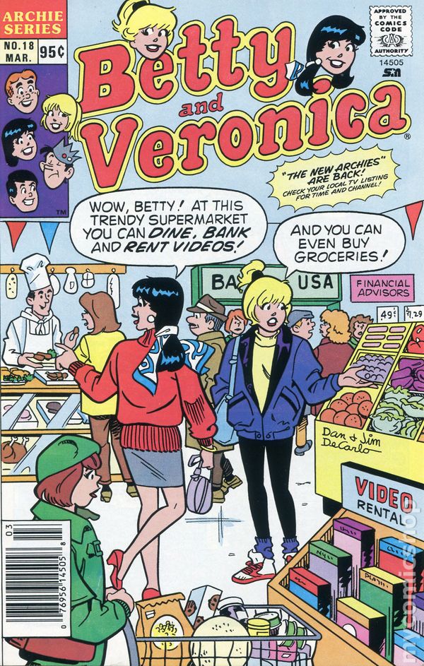 Canadian Price Variant. 95¢ cover price. Written by Harold Smith, Kathleen Webb, and George Gladir. Art by Dan DeCarlo and Jim DeCarlo. Cover by Dan DeCarlo. Tired of being upstaged by Veronica on everything, Betty and Dilton think up a plan to outshine her. Veronica gets carried away with having her own car phone. Veronica uses her pool as an attraction to sell ice cream for her new job. Health Education public service announcement with the Archie gang concerning AIDS, art by Dan DeCarlo. Sunkist Fun Fruits ad with the Archie gang. Ad for Archie Annual Comics Digest Magazine #53. Fruitslush ad with the Archies. Veronica's Beach Wear fashion page, art by Dan DeCarlo. Letters page with advice from Betty And Veronica, art by Dan DeCarlo. 36 pages, full color. Cover price $0.95.
