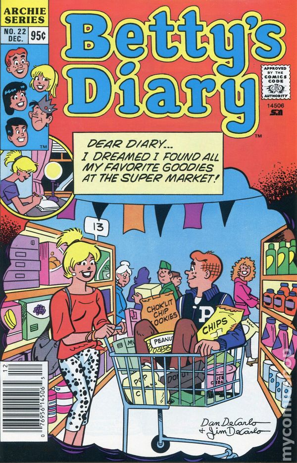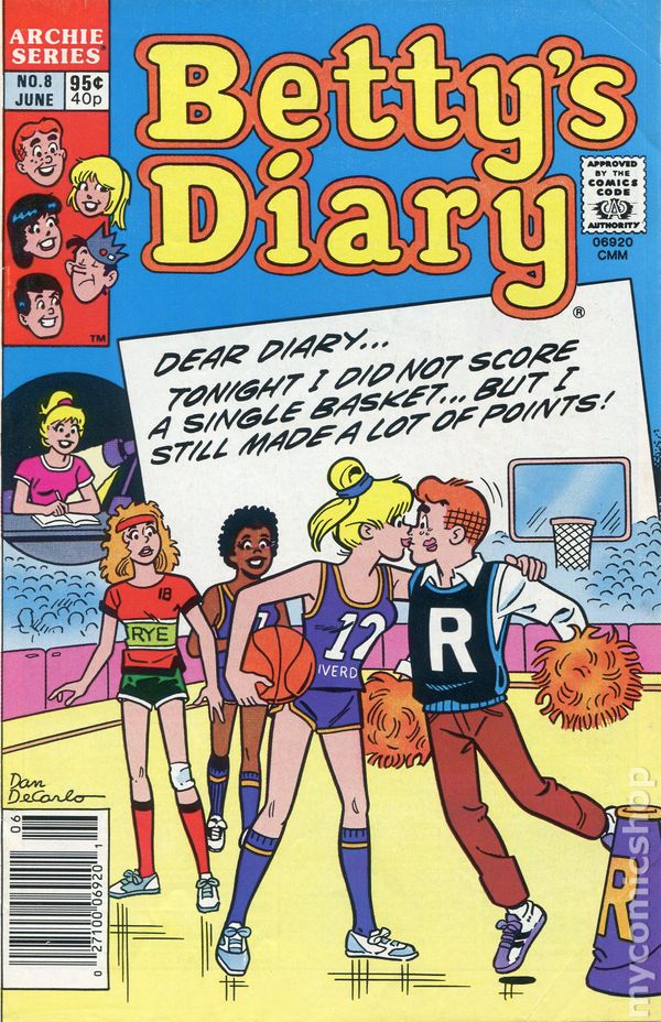 Canadian Price Variant. 95¢ cover price. Cover by Dan DeCarlo. AIDS awareness public service announcement with the Archie gang. "Dairy X 3," script by Kathleen Webb, pencils by Stan Goldberg, inks by Rudy Lapick; Betty catches Veronica reading her diary; But Betty really has 3 diaries that she writes in. "Winter Too Soon," script by Rod Ollerenshaw, pencils by Stan Goldberg, inks by Rudy Lapick; Betty befriends an older woman who is a famous mystery writer; When the woman passes away suddenly, Betty is at a loss as to how to cope with her friend's death. "Crushes I've Had," script by George Gladir, pencils by Stan Goldberg, inks by Mike Esposito; Betty re-reads her diary and remembers all of her crushes when she was very young. 36 pages, full color. Cover price $0.95.