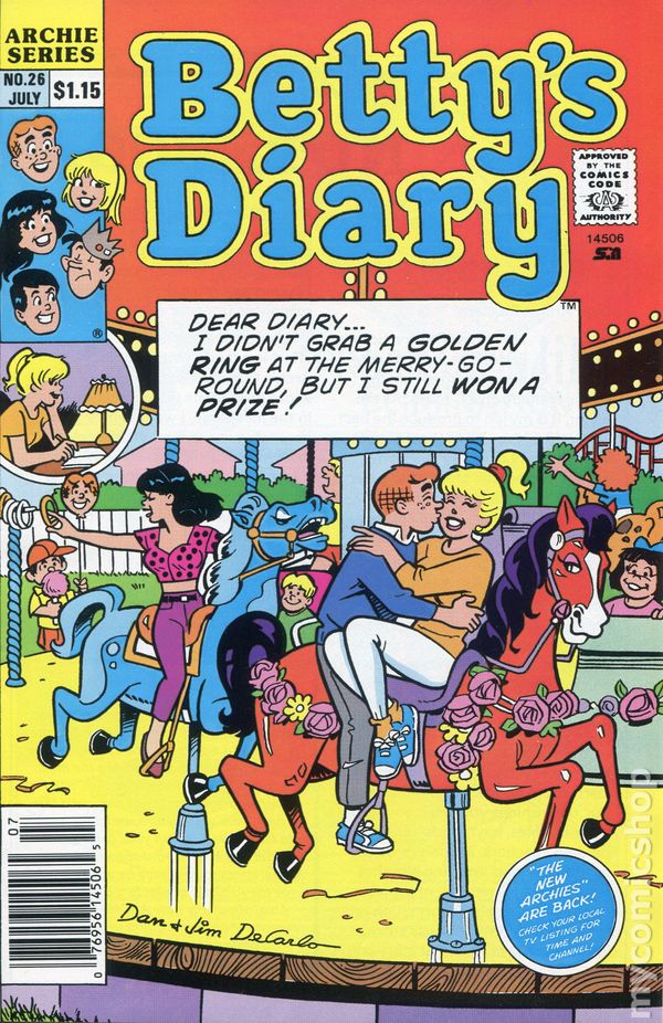 Canadian Price Variant. First $1.15 cover price. Cover pencils by Dan DeCarlo, inks by Jim DeCarlo. "What's in a Name?", script by Kathleen Webb, pencils by Stan Goldberg, inks by Mike Esposito; Betty checks a book out of the library that explains the meaning behind everybody's name. "Betty's Diary Combination" activity page. "One for the Books," script by George Gladir, pencils by Stan Goldberg, inks by Rudy Lapick. "All that Glitters," script by Kathleen Webb, pencils by Stan Goldberg, inks by Henry Scarpelli; Veronica misplaces her grandmother's diamond ring. "Touching All Bases" one-page story starring Sabrina. "Love at First Sight," script by George Gladir, pencils by Stan Goldberg, inks by Rudy Lapick; Betty reads some old entries in her diary about a boy she fell in love with a year earlier but soon fell out of love with. 36 pages, full color. Cover price $1.15.