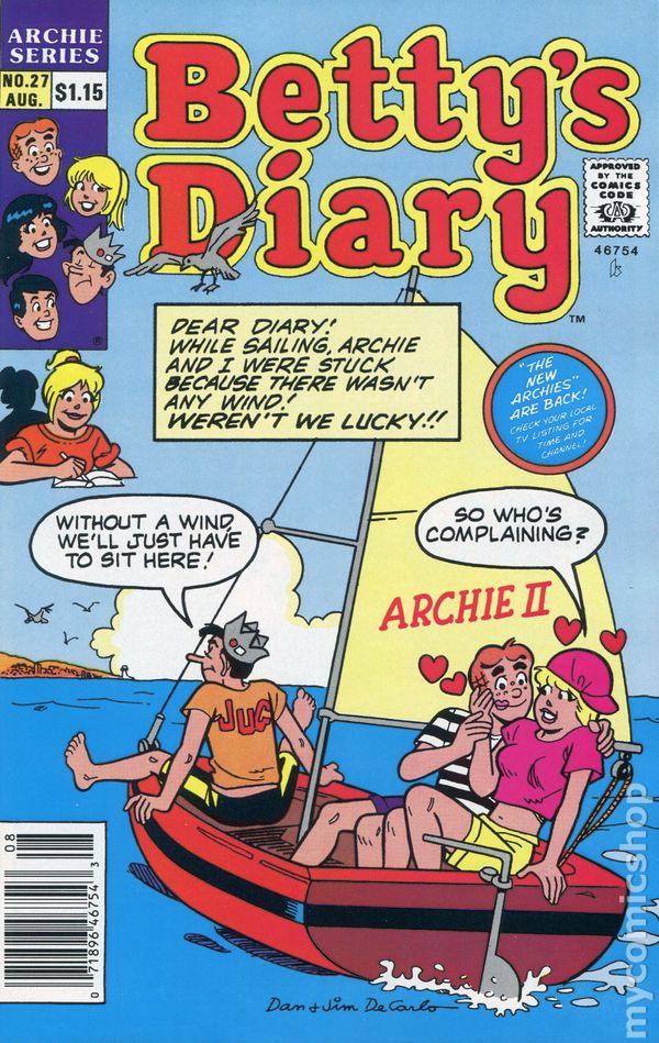 Canadian Price Variant. $1.20 cover price. Cover art by Dan DeCarlo. "Extra Sensory Detection," script by Kathleen Webb, pencils by Bob Bolling, inks by Mike Esposito; Betty and Archie begin using Jughead as a go-between to foil Veronica's uncanny ability to sense when Archie's about to ask Betty out. "Who Am I?", script by Frank Doyle, pencils by Doug Crane, inks by Rudy Lapick; Betty learns a valuable lesson when she tries to act like Veronica. "Little Blackmail Book," script by Kathleen Webb, pencils by Doug Crane, inks by Mike Esposito; Betty finds Veronica's little black book. "Dress Code" half-page story starring Sabrina. "Running Mate," script by Mike Pellowski, pencils by Bob Bolling, inks by Mike Esposito; Ethel and Midge talk Betty into running for class president. Veronica then decides she wants to be president and runs against her. 36 pgs., full color. Cover price $1.20.