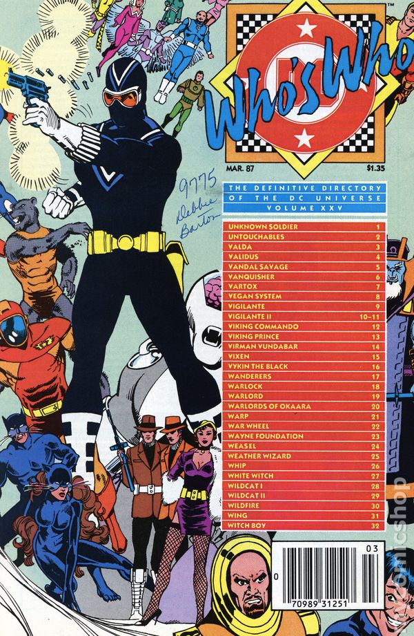 Canadian edition with $1.35 cover price. Written primarily by Len Wein and Marv Wolfman (with research by E. Nelson Bridwell and others), Who's Who is a meticulously detailed, alphabetically arranged series of reference volumes that provides personal data, history, and powers and weapons for countless DC characters, both popular and obscure, both new (circa mid 1980s) and old. Volume twenty five has entries for Vandal Savage, Warlock, the Weather Wizard, Wildcat, and many others. Character renderings are by such artistic greats as Ernie Colon, Brett Breeding, Joe Kubert, Todd McFarlane, and Gene Colan. FULL DETAIL: 25 - Character/artist listing: Unknown Soldier by Joe Kubert; Untouchables by Jose Luis Garcia-Lopez; Valda by Ernie Colon; Validus by Curt Swan and Larry Mahlstedt; Vandal Savage by Denys Cowan and Greg Brooks; Vanquisher by Greg LaRocque and Greg Brooks; Vartox by Curt Swan and Brett Breeding; Vegan System by Todd Klein; Vigilante by Gray Morrow; Vigilante II by Tod Smith and Rick Magyar; Viking Commando by Karl Kesel; Viking Prince by Joe Kubert; Virman Vundabar by Jack Kirby and Steve Rude; Vixen by Luke McDonnell and Bob Smith; Vykin the Black by Jack Kirby and Karl Kesel; Wanderers by Mike Clark and Pablo Marcos; Warlock of Ys by Gil Kane; Warlord by Mike Grell; Warlords of Okaara by Tod Smith; Warp by George Perez; War Wheel by Dan Spiegle; Wayne Foundation by Terry Austin; Weasel by Joe Brozowski and Dennis Janke; Weather Wizard by Carmine Infantino and Murphy Anderson; Whip by Mike Gustovich; White Witch by Mike DeCarlo and Larry Mahlstedt; Wildcat I by Irwin Hasen; Wildcat II by Todd McFarlane and Jerry Ordway; Wildfire by Dave Cockrum; Wing by Gene Colan and Art Nichols; Witch Boy (Klarion) by Jack Kirby and Greg Theakston. Kevin Maguire/Dick Giordano cover. Cover price $1.35.