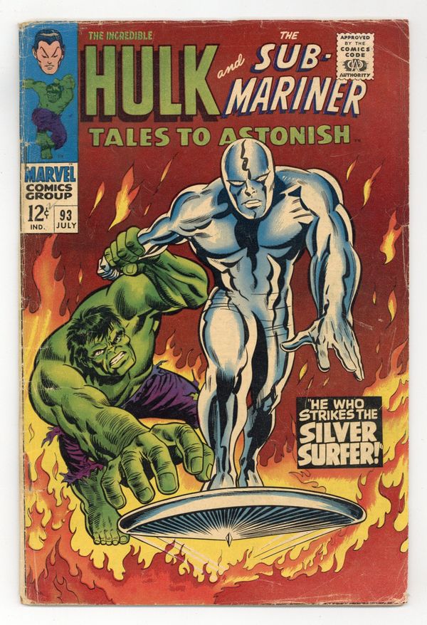 Starts Mar 9 Cover by Marie Severin and Frank Giacoia. The Monarch and the Monster, script by Roy Thomas and Dan Adkins; As Namor battles It, torpedoes from the submarine cause an avalanche, trapping It; Namor turns on the submarine and begins to punch holes in it; It (the creature) returns and they battle, further damaging the submarine and (apparently) killing it;The submarine leaves (with the carcass of It) while Namor breaks off, feeling weakness overwhelm him. He Who Strikes the Silver Surfer, script by Stan Lee, art by Marie Severin; Having 'caught' the Silver Surfer (believing him to be an alien starship), Hulk starts a fight with perhaps the only being on Earth stronger than Hulk is; The Surfer, irritated, knocks him out, then probes Hulk to discover the reason for his belligerence and discovers the damage done by the gamma radiation; Just as the Surfer prepares to reverse the damage and return Dr. Banner's life, Hulk wakes up and, seeing the action as an attack, lashes out. 36 pages, full color. Cover price $0.12.