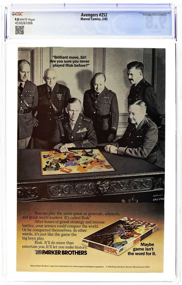Direct Edition. "The Ties that Bind!" Part 2 of 3. Guest-starring the Eternals. Script by Roger Stern. Art by Al Milgrom (breakdowns) and Joe Sinnott (finishes). Cover by Al Milgrom and Joe Sinnott. In Northern Greece the Wasp and Starfox wake up in the company of the Eternals! Last issue's battle was a huge misunderstanding! And now Starfox learns that he is also an eternal! But that revelation means he must participate in the ritual of the Uni-Mind! In spectacular fashion, all of the Eternals including Starfox take to the sky and become the single entity known as the Uni-Mind! Leaving the Wasp and Captain Marvel gasping in awe! One potential problem though...what if a super-villain were to attack Olympia, while the Eternals are formed in the Uni-Mind? Look out! Retelling of the Eternals' origin. Cameo appearances by She-Hulk, Quicksilver, Lockjaw, and Maelstrom. Flashback cameos by Chronos, Zuras, Mentor, Sui-San, and Thanos to recap the history of Titan; and Magneto, Modred, and Bova to recap the events of the Vision and the Scarlet Witch Limited Series (1st series) issue 4. (Notes: Maelstrom previously appeared in Marvel Two-in-One 72. This issue includes a full-page ad for the first issue of the West Coast Avengers Limited Series.) 36 pages Cover price $0.60.