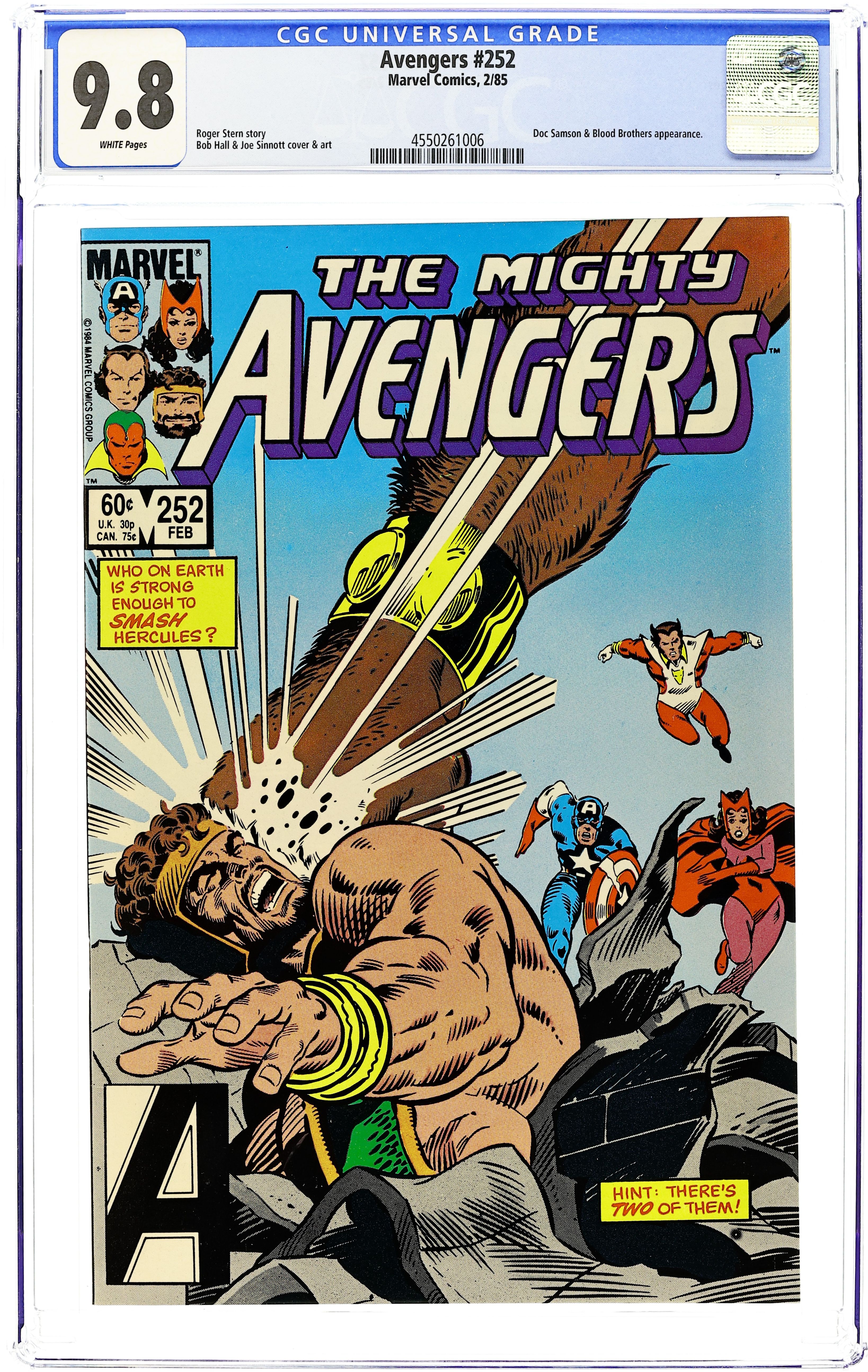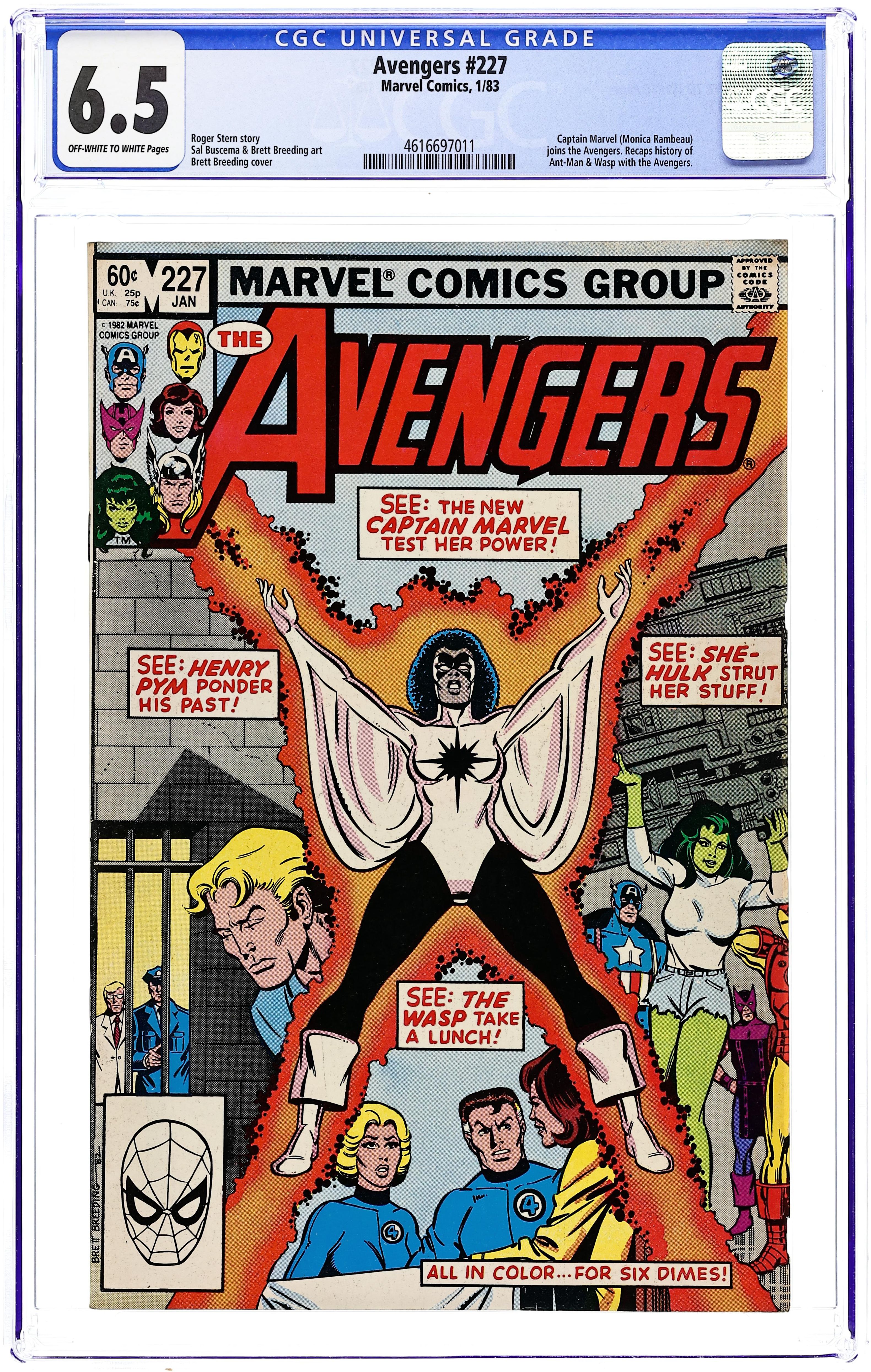 Direct Edition. 2nd appearance, the new Captain Marvel (aka Monica Rambeau). "Testing...1...2...3!" Script by Roger Stern. Pencils by Sal Buscema. Inks by Brett Breeding. Cover by Brett Breeding. After a quick test of her amazing powers, the Avengers offer membership to the new Captain Marvel (aka Monica Rambeau). Meanwhile at Ryker's Island, a psychiatrist visits Hank Pym to determine his fitness to stand trial for his crimes in Avengers 217. But as the former avenger prepares for his trial, Egghead gets ready for Hank's trial too! Everyone is headed to the courthouse next issue! Origin of Ant-Man, Giant-Man, Goliath, and Yellowjacket. Cameo appearances by the Plant-Man, Wizard, Mr. Fantastic, Invisible Girl, and Egghead. Flashback cameos by the Black Panther, Hulk, Scarlet Witch, Tigra, Ultron, Vision, and Wonder Man to recap the history of Henry Pym. Second appearance of the new Captain Marvel. Avengers Lineup: Captain America, Hawkeye, Iron Man, She-Hulk, Thor, and the Wasp. (Notes: Captain Marvel debuted in Amazing Spider-Man Annual 16. Roger Stern begins his 5-year run as the writer for the Avengers title. This issue features a two-page ad for the Spider-Man vs. Green Goblin Atari video game.) 36 pages Cover price $0.60.
