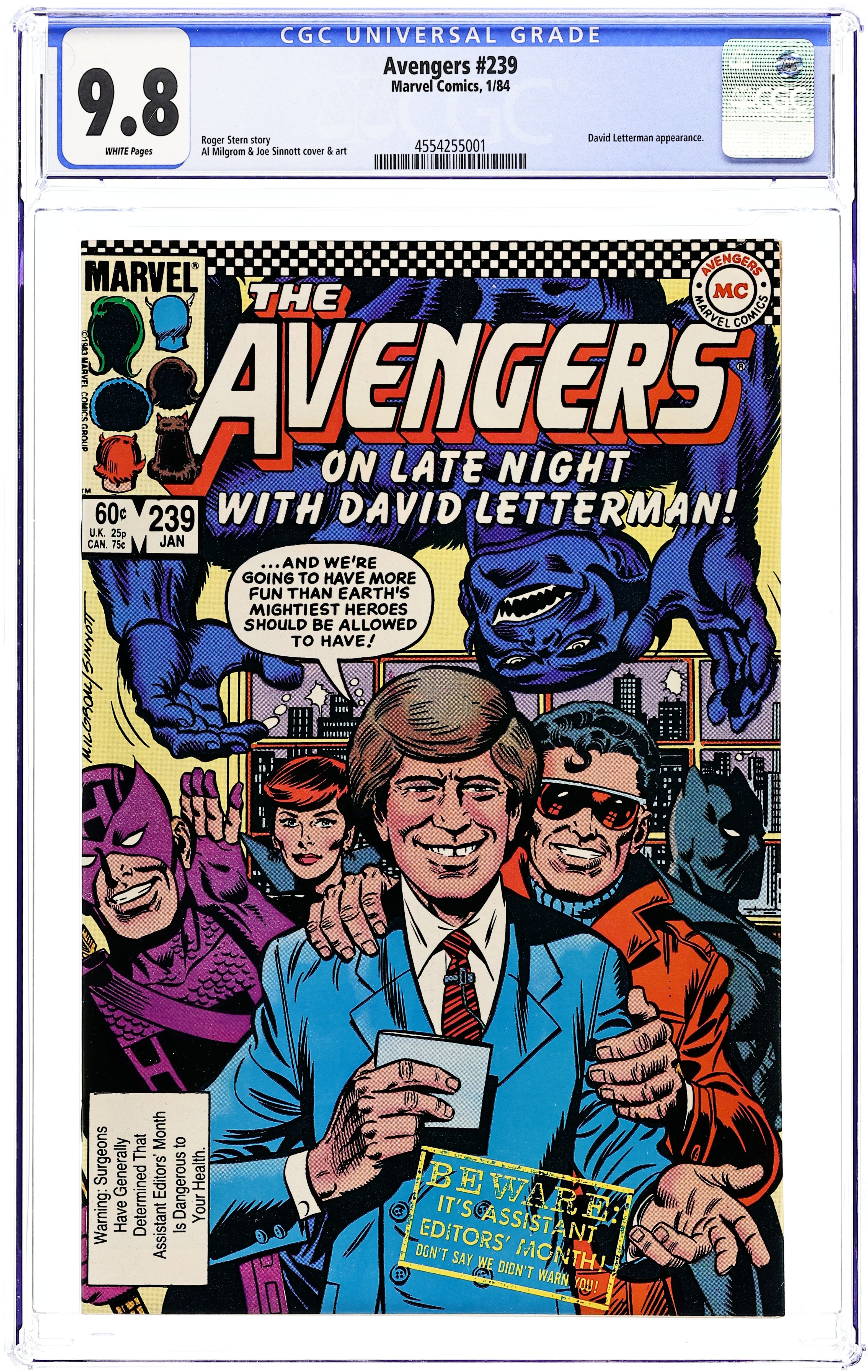 "Late Night of the Super-Stars!" Script by Roger Stern. Pencils by Al Milgrom. Inks by Joe Sinnott. Cover by Al Milgrom and Joe Sinnott. Hawkeye returns to Avengers Mansion with his new bride, Mockingbird! However, the Avengers are on their way to San Francisco, so only the Vision is home to greet the ace archer. Several minutes later Wonder Man calls...in need of a big favor! He's been booked on Late Night with David Letterman and needs several other avengers to appear with him! The Beast, Black Panther, Black Widow, and Hawkeye agree to join Simon on the show! But Fabian Stankowicz decides that he's ready for a guest appearance too! With the bright lights shining and the cameras rolling, the all-out action on the Late Night set begins! It's going to take all of the reserve avengers plus David Letterman to knock out Fabian and his annoying inventions! A fun issue! Assistant Editors' Month. Cameo appearance by Paul Shaffer. Avengers Lineup: Beast, Black Panther, Black Widow, Hawkeye, Mockingbird, Wonder Man, and the Vision. (Notes: This issue includes the first meeting between Mockingbird and the Black Widow, two of Hawkeye's leading ladies. The letters page features a parody by Assistant Editor Mike Carlin.) 36 pages Cover price $0.60.