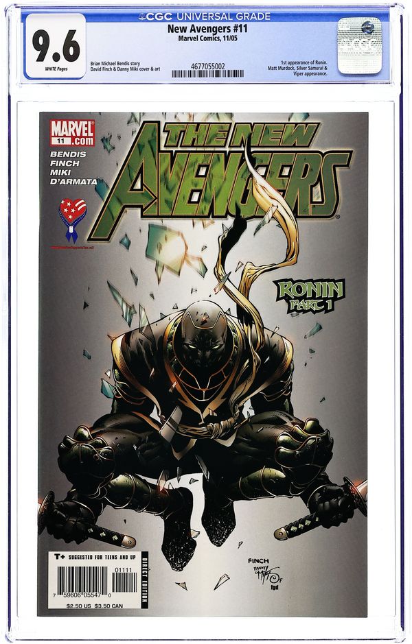 Direct Edition. $2.50 cover price. Written by Brian Michael Bendis Pencils & Cover by DAVID FINCH 'RONIN' Part 1 (of 3) David Finch returns to debut the mysterious New Avenger everyone has been talking about all year!! Who is RONIN and why has Captain America recruited him into the fold? Bet it has something to do with Hydra helping the Silver Samurai get out of the country after he broke out of prison. Just sayin'! And what is Ronin's true identity? Here's a hint: He's not Daredevil! Cover price $2.50.