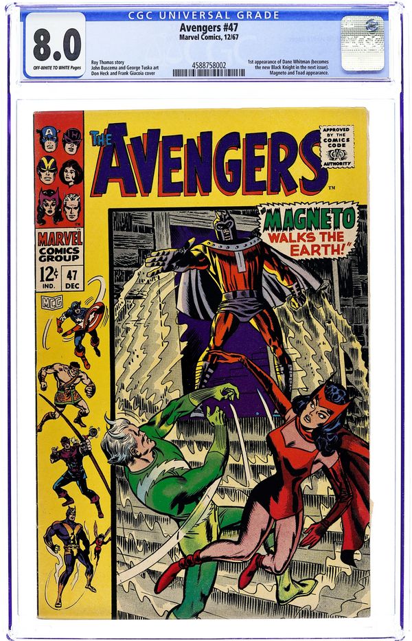 First appearance of Dane Whitman in "Magneto Walks the Earth!" Script by Roy Thomas. Pencils by John Buscema. Inks by George Tuska. Cover by Don Heck and Frank Giacoia. Magneto is back on Earth! And his first priority is reviving the Brotherhood of Evil Mutants! And to do that he sets a trap for two of Earth's Mightiest Heroes! After Magneto and the Toad subdue Dane Whitman and his assistant in Garrett Castle, they send a phony distress call to Avengers Mansion! When the mutant twins respond to the call, the ruse is revealed! And the battle begins! Quicksilver and the Scarlet Witch vs. the Master of Magnetism! Oh my, do Pietro and Wanda have a chance vs. Magneto? An awesome issue! Cameo appearances by the Black Widow and Whirlwind. Flashback cameos by Iron Man and Nathan Garrett to recap the death of the villainous Black Knight in Tales of Suspense #73. Avengers Lineup: Hawkeye, Goliath (aka Hank Pym), Hercules, Quicksilver, Scarlet Witch, and the Wasp. (Notes: Captain America leaves the Avengers in this issue. Magneto previously appeared in Uncanny X-Men (1963 1st series) #18. Wanda and Pietro left the brotherhood in Uncanny X-Men #11. This issue was reprinted in Marvel Triple Action #39.) 36 pages. Cover price $0.12.