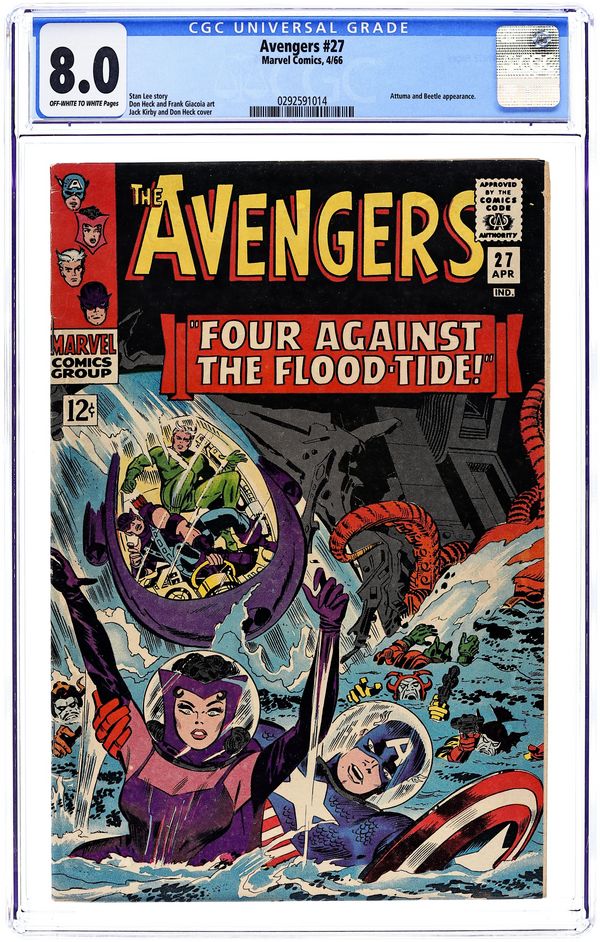 Cover pencils by Jack Kirby, inks by Don Heck. "Four Against the Floodtide," script by Stan Lee, pencils by Don Heck, inks by Frank Giacoia (as Frankie Ray); Hawkeye remembers how to work the message machine but is attacked by the Beetle before he gets a chance; He defeats the Beetle, reads the message and, sets off to help; Hawkeye finds a beaten Quicksilver and together they help defeat Attuma; Captain America sabotages Attuma's controls, and the base collides with his wave machine, destroying it; They return to find the Beetle missing and an important message on the computer involving the Wasp. Avengers roll call: Captain America, Hawkeye, Quicksilver, and the Scarlet Witch. Chet Huntley and David Brinkley cameos. Reprinted in Marvel Triple Action #21. 36 pgs., full color. $0.12. Cover price $0.12.