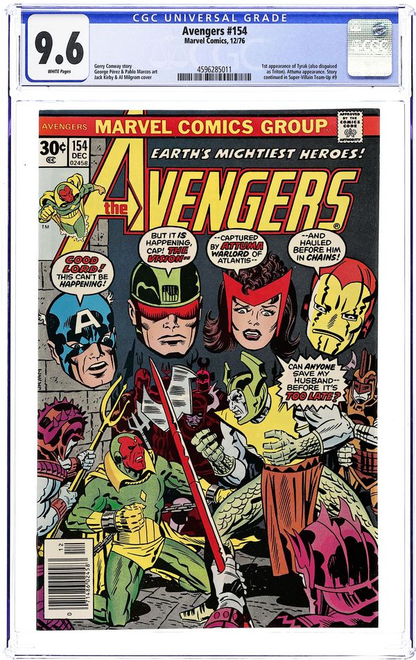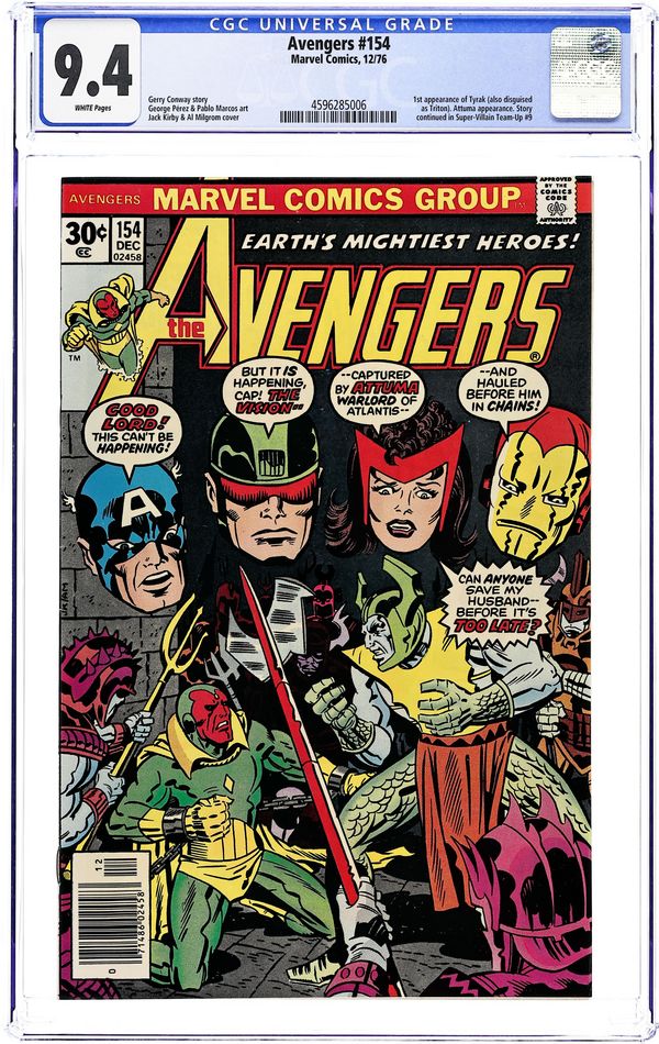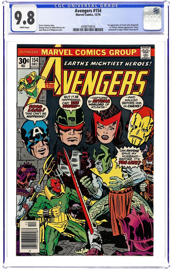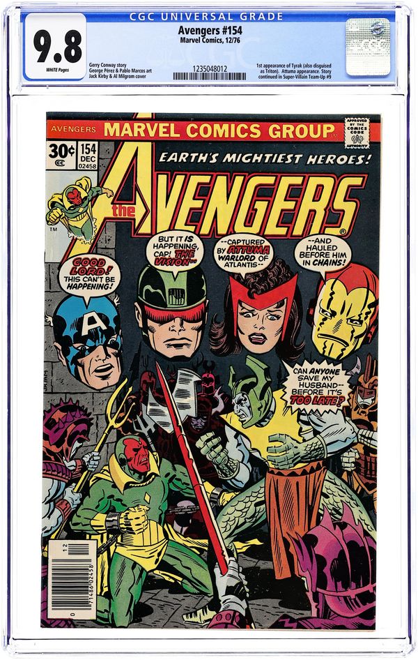 "When Strikes Attuma?" Part 1 of 4. Script by Gerry Conway. Pencils by George Perez. Inks by Pablo Marcos. Cover by Jack Kirby and Al Milgrom. Following the Avengers' awesome battle against the Living Laser in Avengers Annual 6, the Vision drops the Serpent Crown into the Pacific Ocean to dispose of the crown forever. However, on his way back to the mainland, the synthezoid avenger is ambushed by the henchmen of Attuma! Why is Prince Namor's long-time foe attacking the Vision? Meanwhile back at Avengers Mansion, the Scarlet Witch and Jarvis wage a desperate battle for survival against another agent of Attuma...the powerful Tyrak! Will Cap, Shell-head, and the Beast get back to the mansion in time to save their faithful butler and Wanda? The situation does not look good for Earth's Mightiest Heroes! Story (part 2) continues in Super-Villain Team-Up 9. First appearance of Tyrak. Cameo appearance by the Whizzer. Avengers Lineup: Beast, Captain America, Iron Man, Scarlet Witch, Vision, Wasp, Wonder Man, and Yellowjacket. (Note: Attuma previously appeared in Super-Villain Team-Up 3.) 36 pages Cover price $0.30.