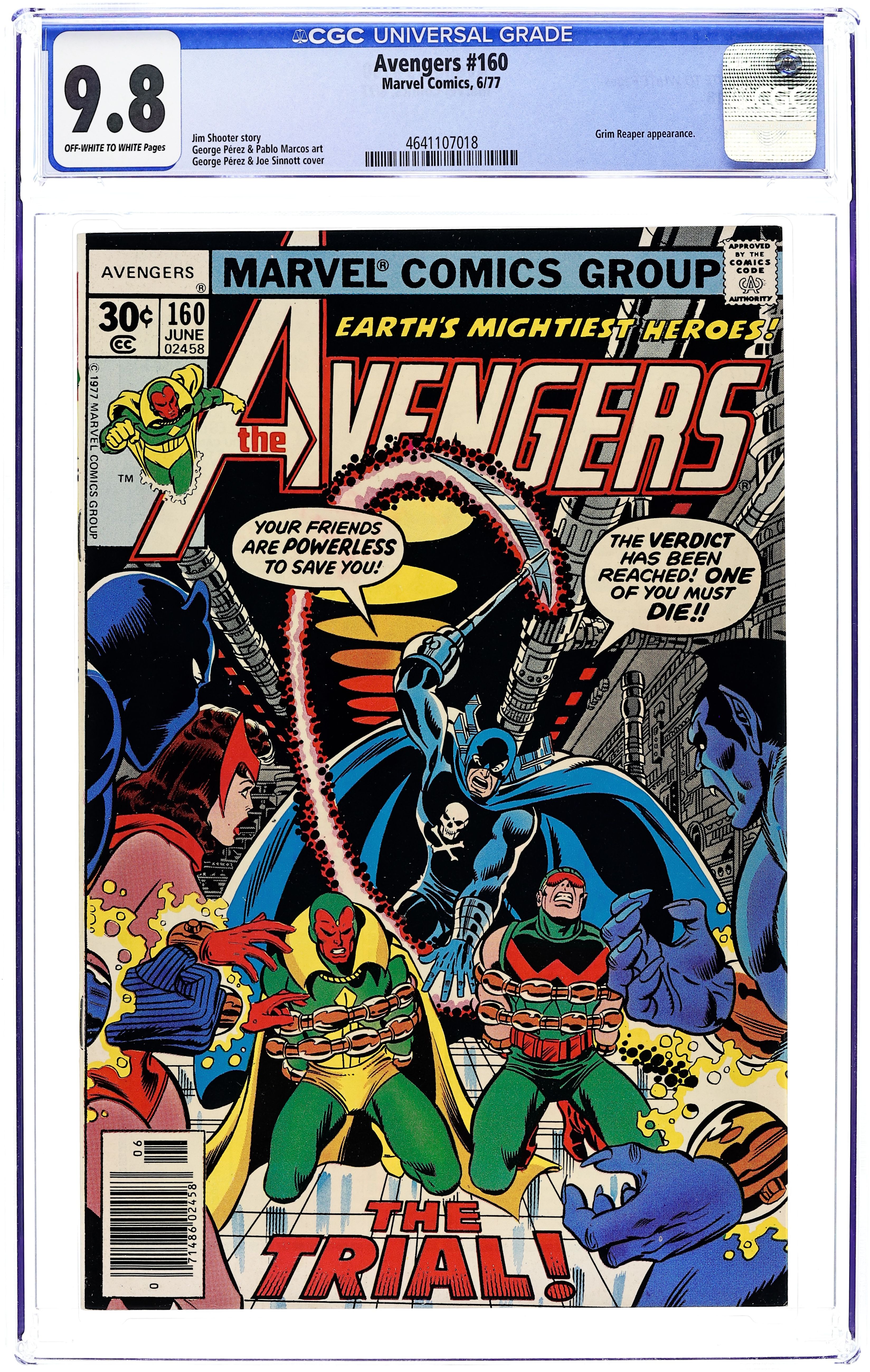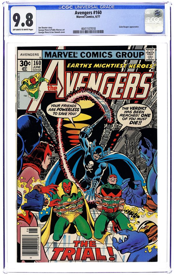 "The Trial!" Script by Jim Shooter. Pencils by George Pérez. Inks by Pablo Marcos. Cover by George Pérez and Joe Sinnott. One of the classic issues of the Avengers! Since Wonder Man's shocking resurrection several issues ago, it was only a matter of time before a particular scythe-wielding super-villain showed up at Avengers Mansion! And the Grim Reaper does not disappoint! After Eric Williams ambushes the Avengers, the trial of Wonder Man and the Vision begins! A sensational issue! Brief re-telling of the origins of the Vision and Wonder Man. Cameo appearances by Captain America, Iron Man, Thor, Wasp, Whizzer, and Yellowjacket. Flashback cameos by Baron Zemo, the Enchantress, Executioner, original Human Torch, Space Phantom, and Ultron. Avengers Lineup: Beast, Black Panther, Scarlet Witch, Wonder Man, and the Vision. (Notes: The Grim Reaper previously appeared in Avengers 108. He returns in issue #3 of the first (1982) Vision and Scarlet Witch limited series. This issue was reprinted in 1993 in the trade paperback: The Greatest Battles of the Avengers. A 35-cent cover price variant exists for this issue.) 36 pages. Cover price $0.30.