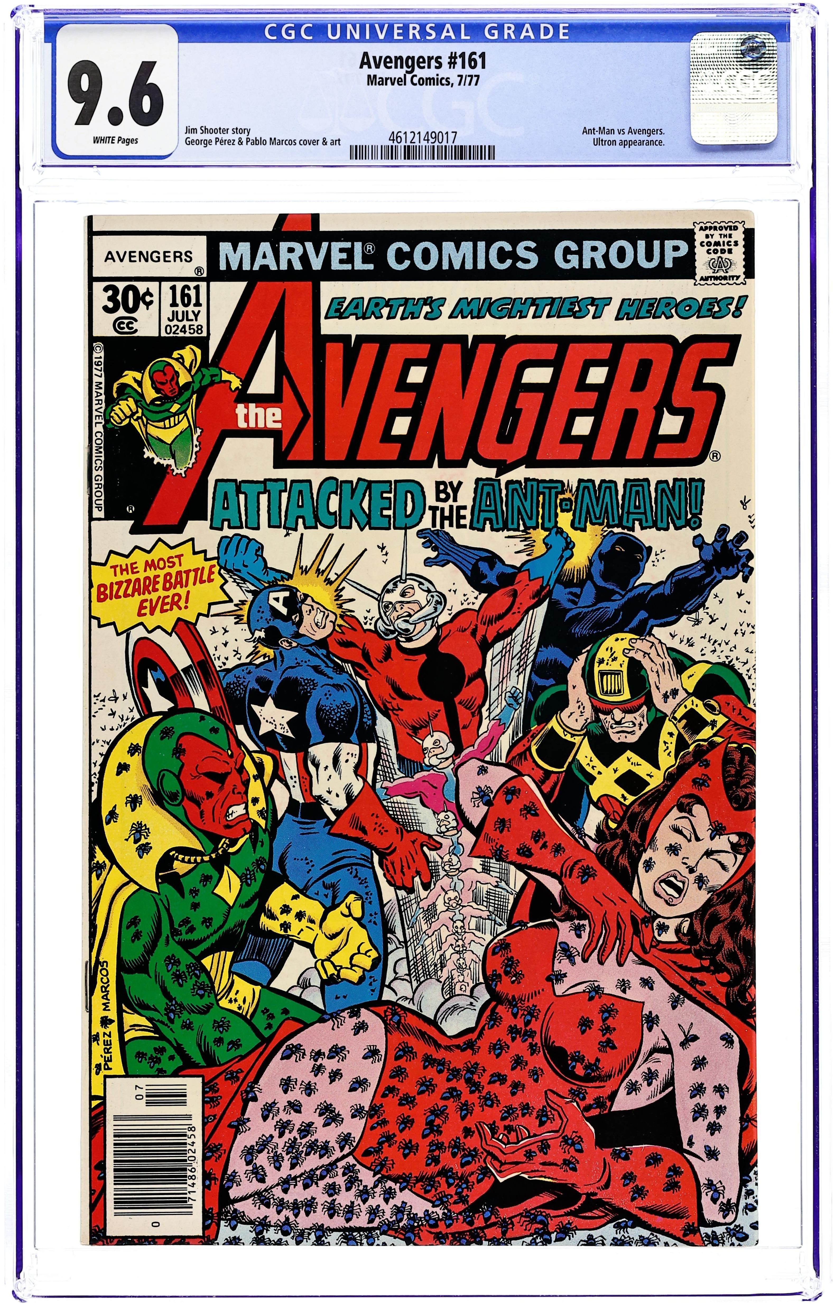 "Beware the Ant-Man!" Part 1 of 2. Script by Jim Shooter. Pencils by George Perez. Inks by Pablo Marcos. Cover by George Perez and Pablo Marcos. In incredible fashion the Avengers are attacked at their Fifth Avenue Mansion! And the assailant is none other than the Ant-Man! What in the world has happened to Hank Pym?!? Fortunately, with help from the Wasp, the Avengers corral their diminutive teammate! But that only buys Earth's Mightiest Heroes a few more hours until the next attacker arrives...a certain adamantium attacker! It's a super showdown inside Avengers Mansion as eight avengers lay it all on the line against Ultron! Cameo appearances by Hawkeye and the Two-Gun Kid. Avengers Lineup: Beast, Black Panther, Captain America, Iron Man, Scarlet Witch, Vision, Wasp, and Wonder Man. (Notes: Ultron previously appeared in Fantastic Four 150. A 35-cent cover price variant exists for this issue.) 36 pgs. Cover price $0.30.