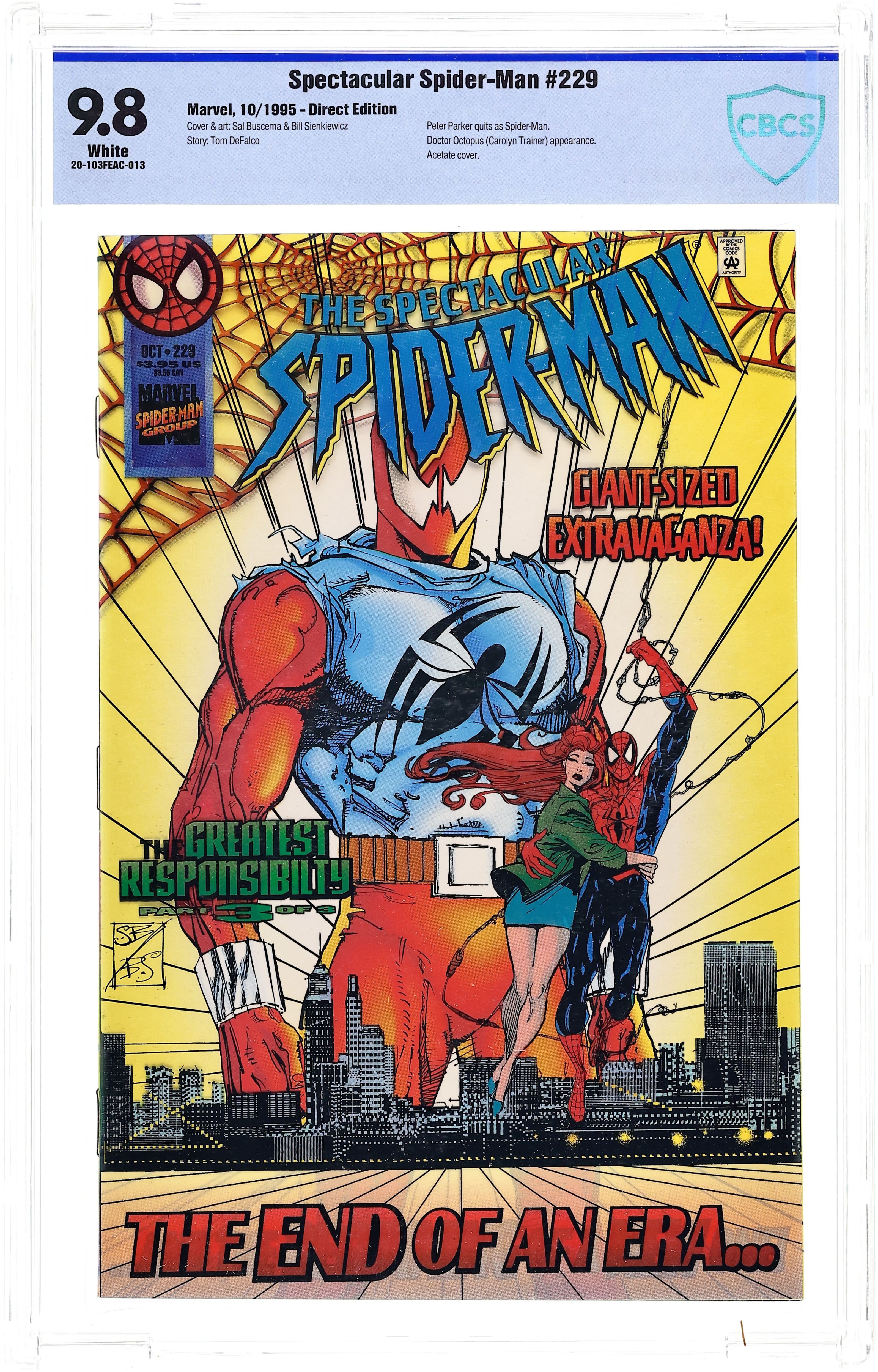 "No More the Hero!" The Greatest Responsibility Part 3 of 3. Giant-sized extravaganza. Direct Edition. Script by Tom DeFalco. Art by Sal Buscema(breakdowns & finishes) and Bill Sienkiewicz (finishes). Wraparound acetate cover by Sal Buscema and Bill Sienkiewicz. Story continues from Spider-Man63. Its a race against time as Mary Jane has fallen deathly ill due to trace exposure to Peter's irradiated blood! Fortunately though Seward Trainer has an antidote en route to the hospital! But Dr. Octopus (aka Carolyn Trainer) and Master Programmer hijack the shipment! So now with MJ's pregnancy in serious jeopardy, the web-slinger and the Scarlet Spider rampage through the city to find Doc Ock! And once they do, the Spectacular Spider-Man goes for broke against the lady octopus! If the wall-crawler can wrest away the antidote and then save his wife, he'll have a life-changing decision to make about his future as your friendly neighborhood Spider-Man!(Notes: The Scarlet Spider appears next in the first issue of Web of Scarlet Spider (1995). Peter Parker and Mary Jane leave New York and appear next in the one-shot Spider-Man The Parker Years (1995); and then in the Spider-Man The Final Adventure (1995) Limited Series. The Spectacular Spider-Man title was briefly replaced in November 1995 by the Spectacular Scarlet Spider series.) 52 pages. Cover price $3.95.