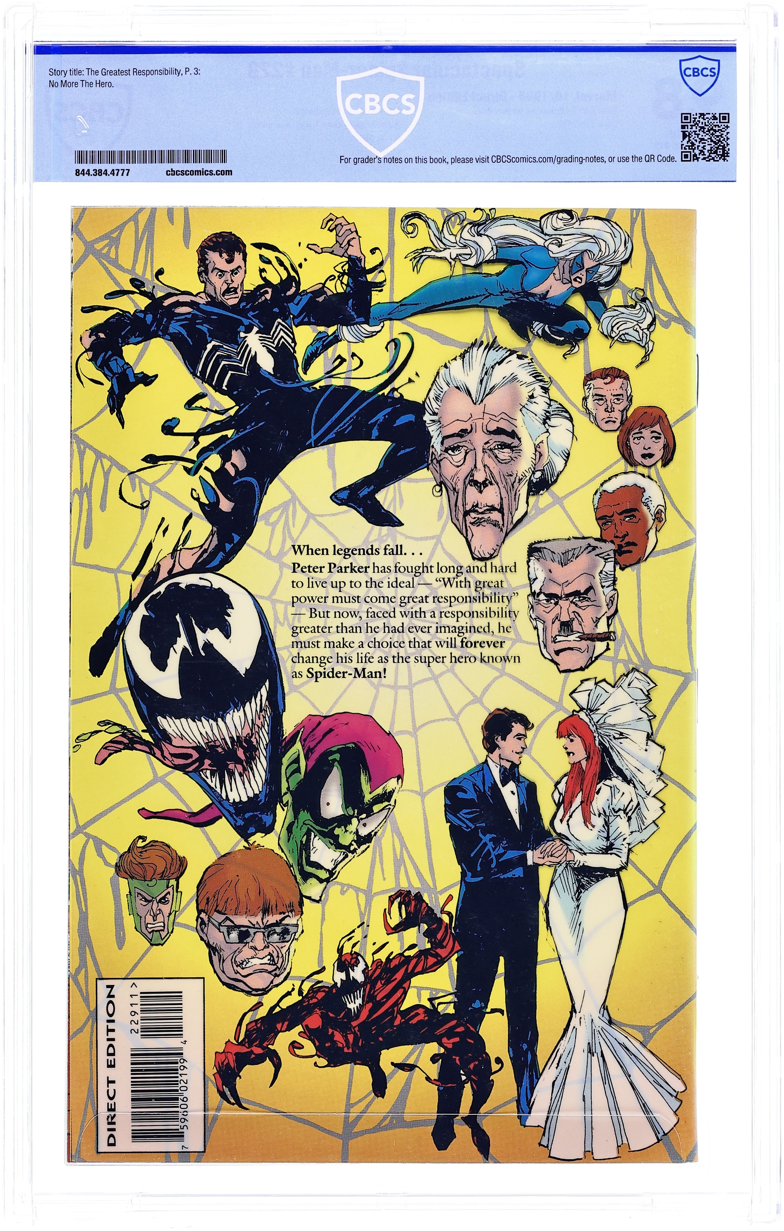 Direct Edition. "Best of Enemies!" Giant-Sized Anniversary Issue. Silver foil cover. Script by J.M. DeMatteis. Pencils and Inks by Sal Buscema. Cover by Sal Buscema. The Green Goblin is on the loose again! And the first thing he does is grab Mary Jane and take her to the top of the Brooklyn Bridge! Oh no! Is the tragic history from Amazing Spider-Man 121 going to repeat itself?! Thankfully not this time as Mary Jane talks sense into the goblin! But Harry's mental state continues to fluctuate between lucidity and lunacy. And his hatred for the web-slinger grows by the day! When will the goblin strike again? The untenable situation has Peter and Mary Jane living on the edge…waiting for the next attack! The fateful day of destiny finally arrives when Harry traps Spider-Man inside his townhouse wired with explosives! The goblin is poised to administer the coup de grâce when he suddenly realizes that little Normie and Mary Jane have just entered the building! And now the wall-crawler's long-time foe (and Peter Parker's long-time friend) faces a series of critical decisions! Save his son? Save Mary Jane? Save Spider-Man? What will the Green Goblin do with three lives on the line? Will years of friendship or years of frustration guide Harry's choices? A heartbreaking ending. Death of Harry Osborn. An unknown percentage of the print run was produced with the foil design misaligned. We do not differentiate between the two, but any slabbed copies listed here with misaligned foil noted on the label will have that notation in our listings as well. 48 pages. Cover price $2.95.