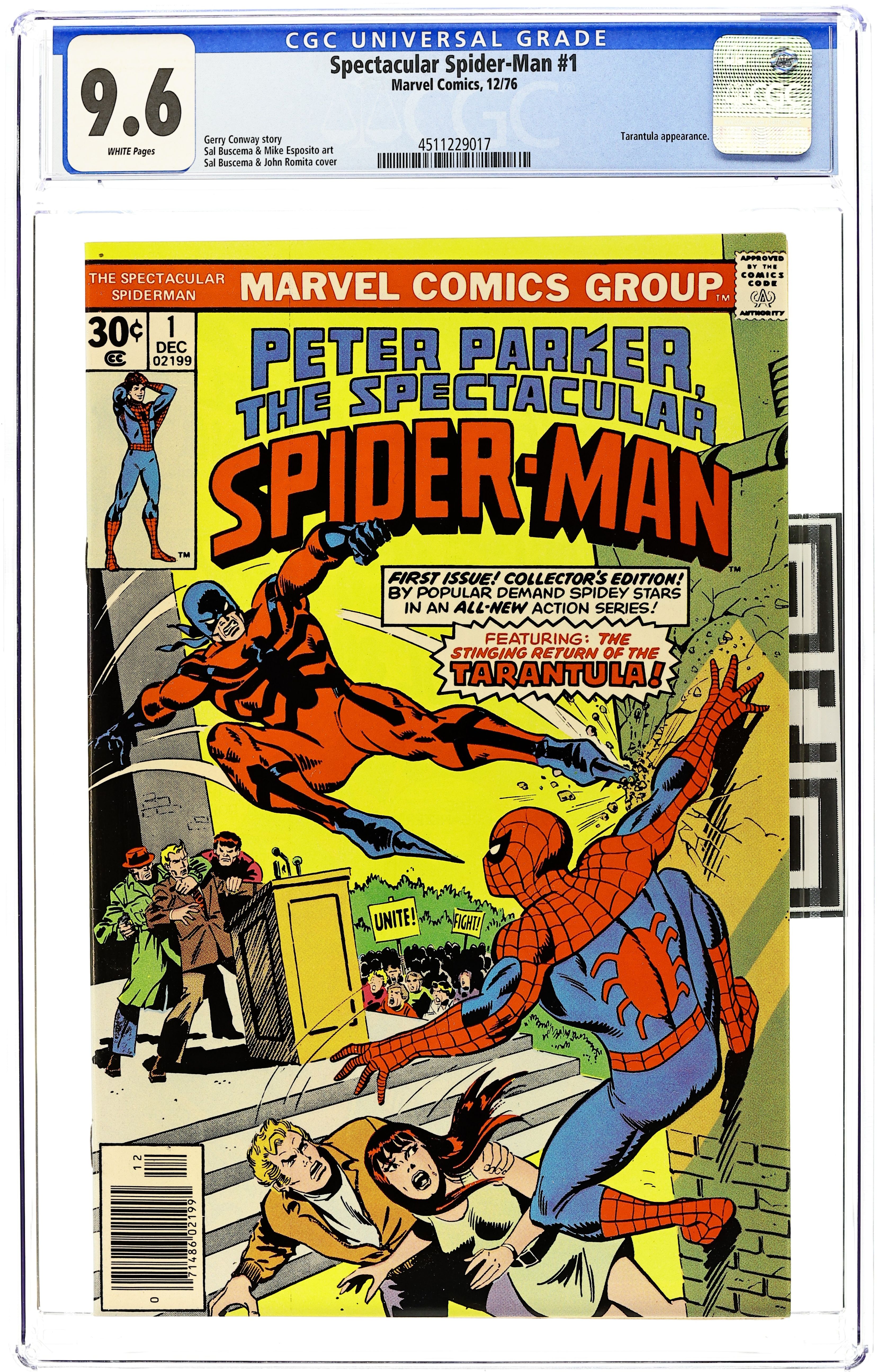 "Twice Stings The Tarantula!" Part 1 of 3. Script by Gerry Conway. Pencils by Sal Buscema. Inks by Mike Esposito. Cover by Sal Buscema and John Romita. The first issue of a brand new series for Spider-Man! The story opens with a bang as the Tarantula kidnaps the Empire State University vice-chancellor, despite the best efforts of the web-slinger, Flash Thompson, and Mary Jane Watson! Next, the Tarantula tries to kill the mayor, but this time the Spectacular Spider-Man is ready! Can the wall-crawler beat the Tarantula and save Mayor Abe Beame? First appearance of Edward Lansky (aka Lightmaster). (Notes: The Spectacular Spider-Man series became the third monthly title for Spider-Man. The first issue of the series debuted the same month as Amazing Spider-Man 163 and Marvel Team-Up 52. The letters page contains an essay from Gerry Conway describing the plans for the new Spider-Man title.) 32 pages Cover price $0.30.