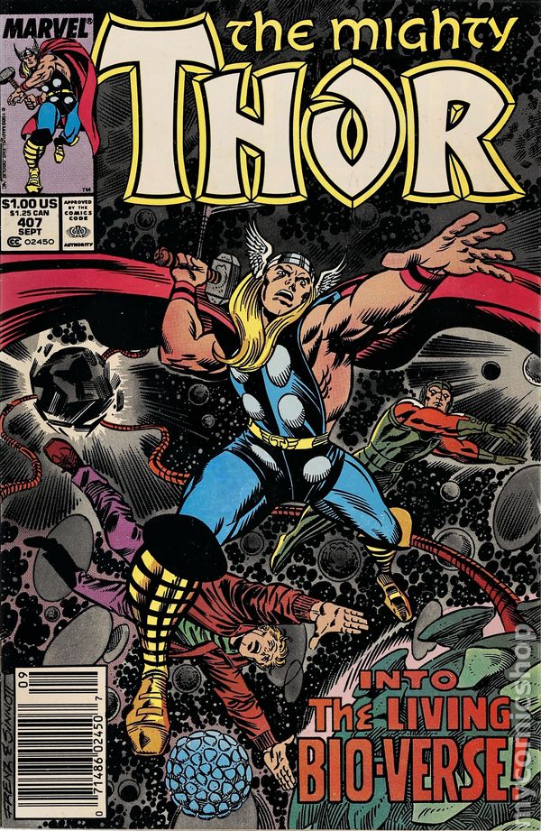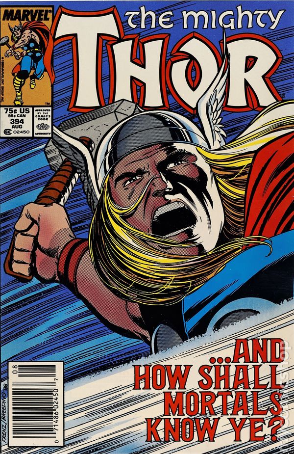 Newsstand Edition. Cover pencils by Ron Frenz, inks by Al Milgrom. Metallic purple cover. Intro new Thor (Eric Masterson) in "Whosoever Holds This Hammer," script by Tom DeFalco and Ron Frenz (plot), pencils by Ron Frenz (layouts), inks by Al Milgrom (finished art); Eric Masterson must begin to learn how to handle the new Thor powers without the guidance of the old Thor; Ulik battles Thor and Code Blue. Bullpen Bulletins. Ron Frenz writes about the retirement of Joe Sinnott. 52 pgs., full color. $1.50. Cover price $1.00.