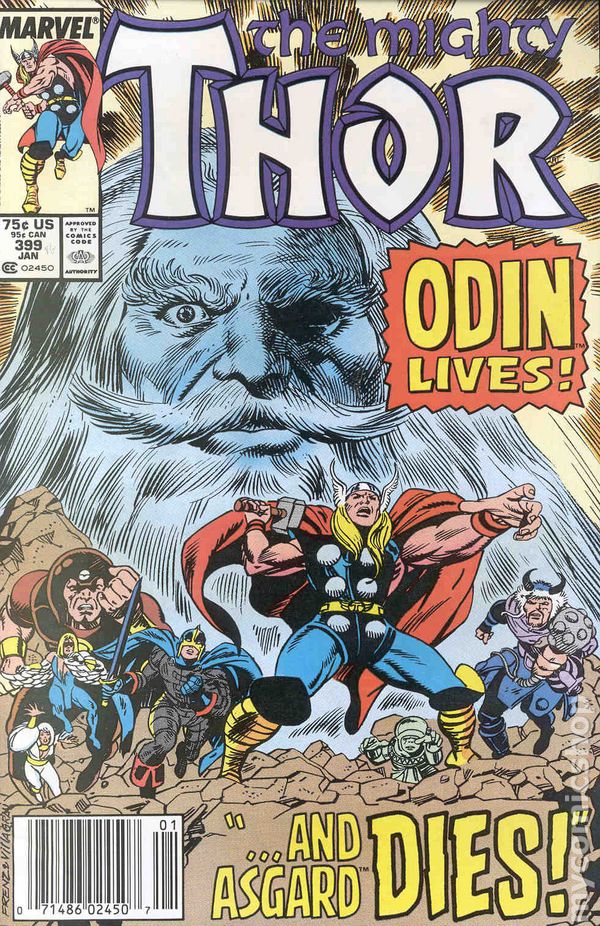 Newsstand Edition. Marvel 25th Anniversary Cover by Walt Simonson and John Romita (border). "The Gift of Death," script by Walt Simonson, art by Sal Buscema; Thor returns to Midgard and tries to pick up the pieces of his life there; After a rousing afternoon with his boss's children, he is warned by his old allies, the Frogs, that something is amiss underground; Venturing into the Morlock tunnels, Thor happens across the Marauders killing the former X-Man, Angel. Continued from X-Factor #11; Mutant Massacre crossover. Bullpen Bulletins. 36 pgs., full color. $0.75. Cover price $0.75.