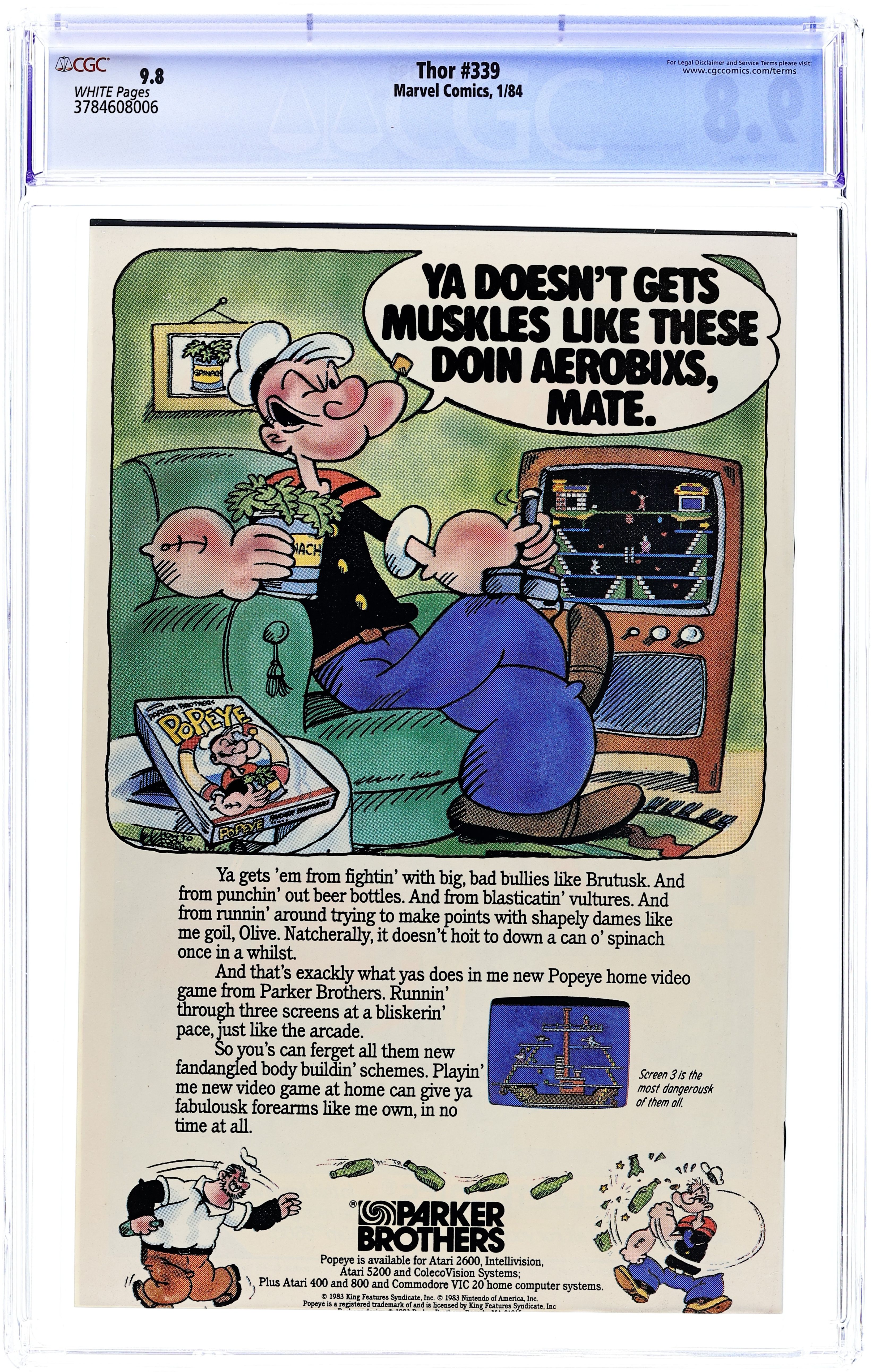 Last 65-cent cover price. Cover by Walt Simonson. Thor battles Kurse in this Secret Wars II crossover, "This Kursed Earth...!", script and art by Walt Simonson; The Beyonder sets up a fight between Thor and Kurse for his own instruction and amusement. Appearances by Power Pack, the Beyonder, and Beta Ray Bill. Loki cameo. Oh, and on the last page, Thor turns into a frog! Cap'n Crunch Cereal ad with Spider-Man. Continued from Secret Wars II (Marvel, 1985 series) #6 and Power Pack (Marvel, 1984 series) #18. Bullpen Bulletins. 36 pgs., full color. $0.65. Cover price $0.65.