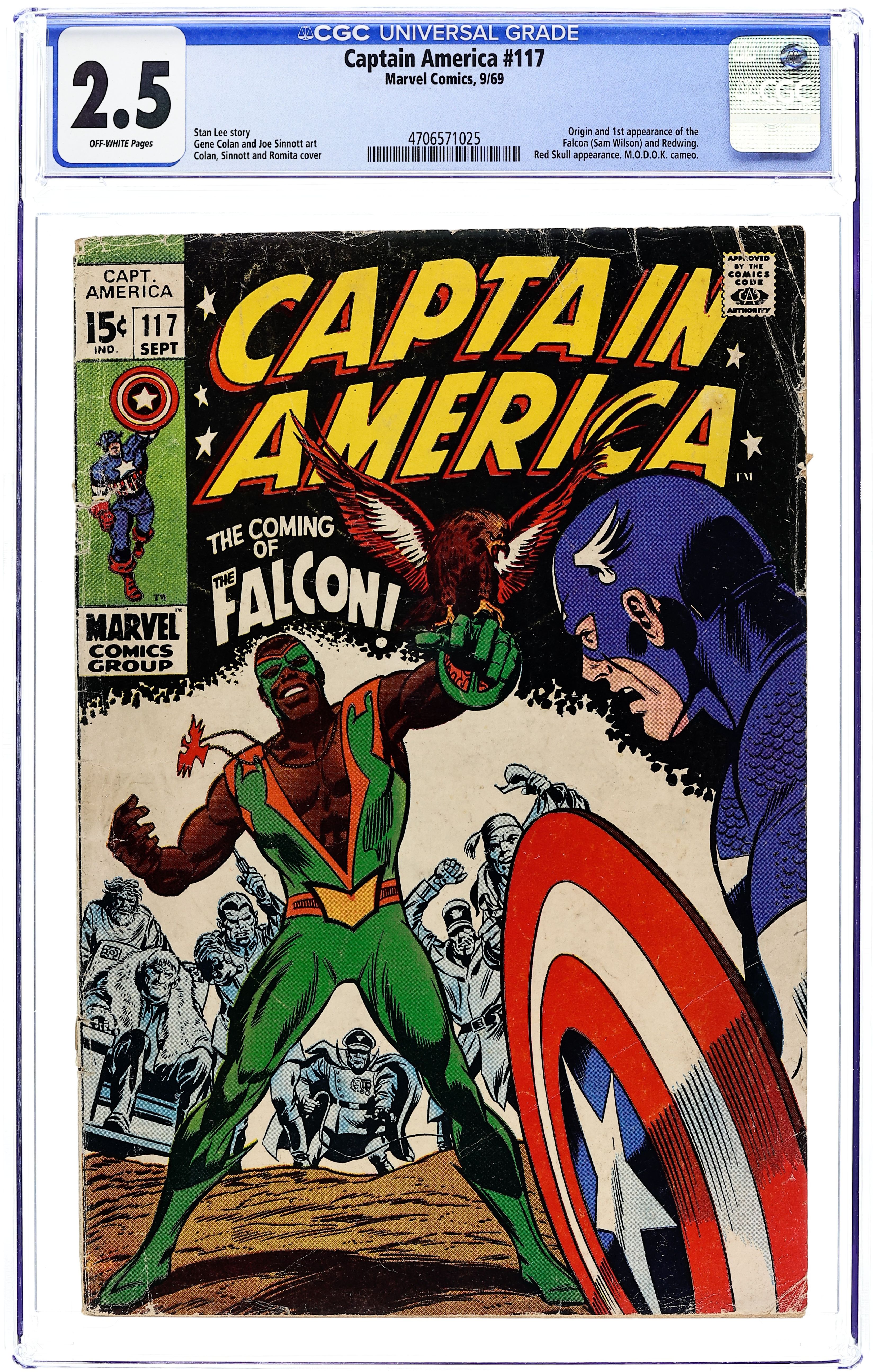 Cover pencils by Gene Colan and John Romita (alterations), inks by Joe Sinnott and John Romita (alterations). First appearance and origin of the Falcon in "The Coming of... the Falcon!", script by Stan Lee, pencils by Gene Colan, inks by Joe Sinnott; With the Red Skull previously having switched bodies with Captain America, the Skull uses the Cosmic Cube to send Cap to the tropical island home of the Exiles; There Cap encounters a falconer from Harlem who had been hired by the Exiles but who is now attempting to help the island natives kick the Exiles from their home; Cap joins forces with the falconer who, with Cap's urging, dons a costume and takes the name the Falcon. Letter to the editor from writer James Van Hise. 36 pgs., full color. $0.15. Cover price $0.15.