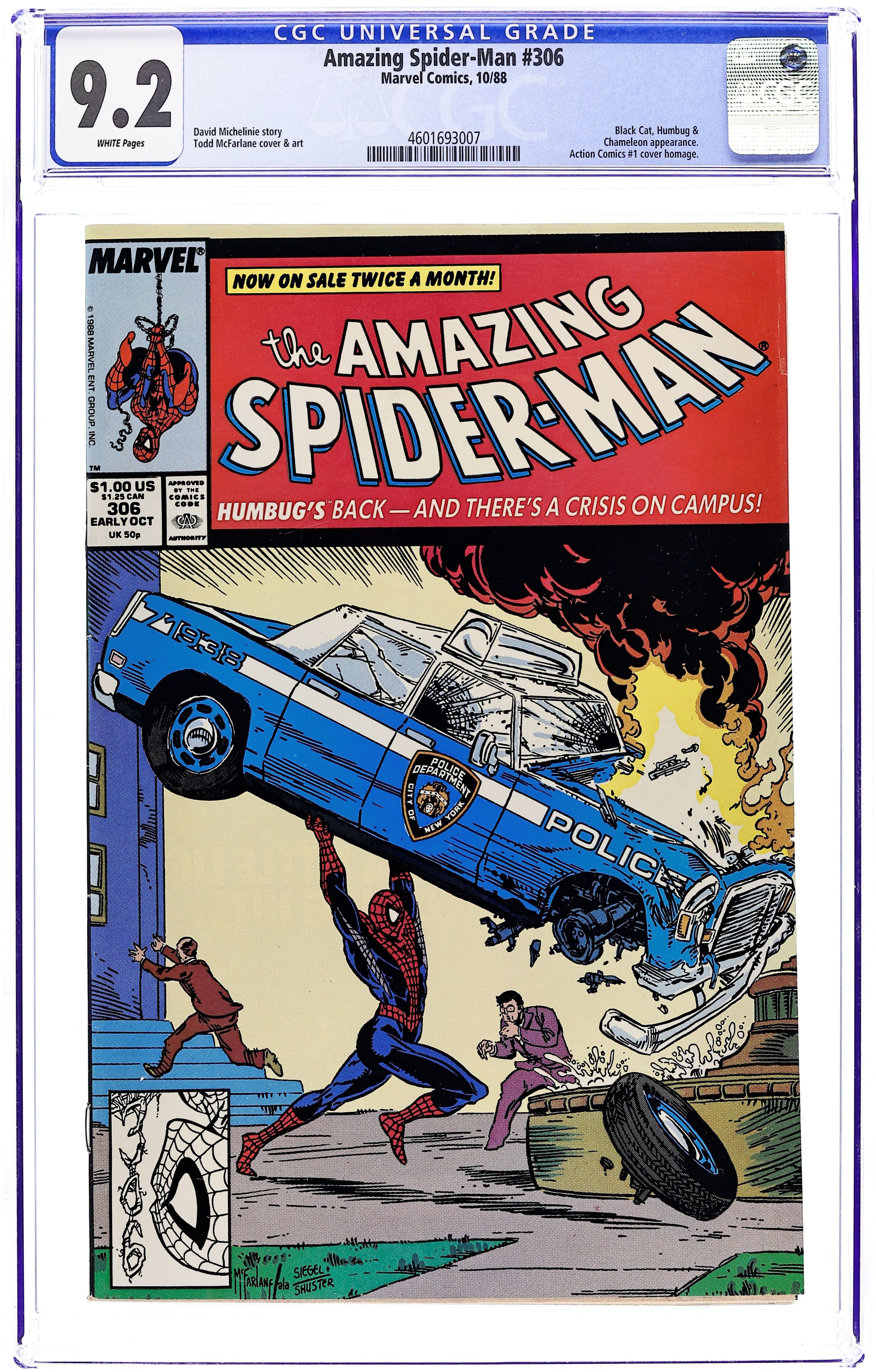 Direct Edition. "Humbugged!" Script by David Michelinie. Art by Todd McFarlane. Cover by Todd McFarlane. The pesky Humbug is back! And the insect-infatuated villain wants to resume his research on the ESU campus! But the crazy entomologist runs into his most-reviled insect first: the Spectacular Spider-Man! Let the extermination begin! Meanwhile at Bedford Towers, Peter and Mary Jane's neighbor, Jonathon Caesar, is acting stranger and stranger...perhaps even a bit obsessive! Cameo appearances by the Chameleon, Aunt May, and the Black Cat. (Notes: The Humbug previously appeared in Web of Spider-Man 19. McFarlane's cover is a tribute to the 50th anniversary of Superman and the cover of Action Comics #1.) 36 pgs. Cover price $1.00.