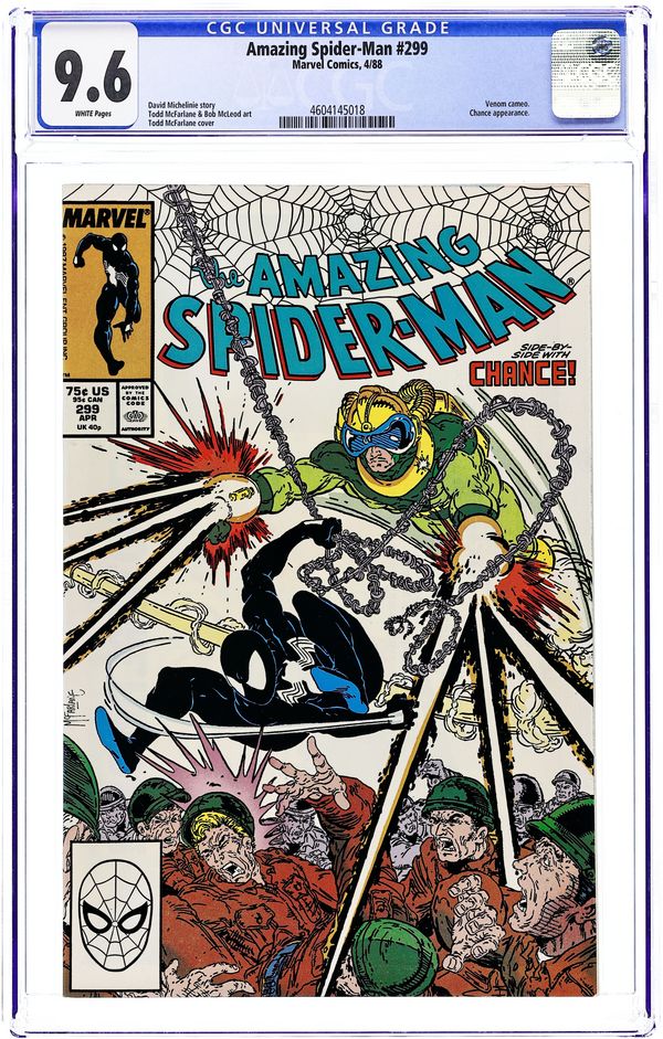 Direct Edition. Giant-sized 25th anniversary issue. First full appearance of Venom in "Venom!", script by David Michelinie, art by Todd McFarlane; Spidey's old alien costume has merged with reporter Eddie Brock who thinks his career was ruined by Spider-Man and the symbiote of the two, Venom, takes on the web slinger; At MJ's request, Spidey returns to the blue and red costume as she now finds his black duds way too creepy; This is the last issue in which Spider-Man appears in his black costume; Thing (of the Fantastic Four) cameo.. Stan's Soapbox Special in place of letters page: Full page editorial by Stan on the occasion of Spider-Man's 300th issue. 52 pgs., full color. Cover price $1.50.