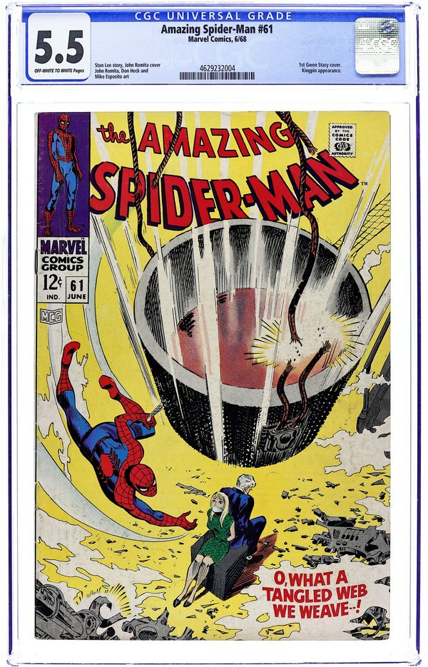 "What a Tangled Web We Weave!" Part 3 of 3. Script by Stan Lee. Art by John Romita (layouts) and Don Heck (pencils). Inks by Mike Esposito (as Mickey Demeo). Cover by John Romita. Gwen Stacy realizes that her father is seriously ill -- plus in danger -- so she takes him to the airport to leave New York City. But the Kingpin's men intercept them in the terminal...and take the pair to their boss' new hideaway -- inside Norman Osborn's chemical plant! After hours of searching, the web-slinger learns where Gwen andCaptain Stacy are being held. And he dashes to their location...for a very personal showdown vs. the Kingpin of Crime! Can the amazing one knock out the Kingpin and save Gwen? Perhaps Norman Osborn (of all people) will lenda hand! Cameo appearances by Mary Jane Watson, Harry Osborn, and J. Jonah Jameson. (Notes: This issue is Gwen Stacy's first cover appearance. This story was reprinted in Marvel Tales #44.) 36 pages. Cover price $0.12.