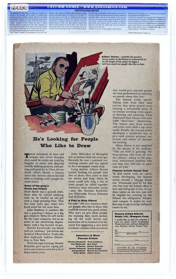 Cover pencils by Jack Kirby, inks by Steve Ditko. "I Found the Girl in the Blue Glass Bottle!", pencils by Jack Kirby, inks by Dick Ayers; A curio shop owner uses an ancient magic bottle to shrink people, but one of his victims turns the magic of the bottle on him and escapes, as the shop owner shrinks to nothing. "Tricky Travel" text story. "The Forbidden World!", pencils by Jack Kirby, inks by Dick Ayers; A space patrol find an alien world surrounded by a strange mist. "The Coming of the Giants!", art by Don Heck; The humanity of the near future grow proud as they approach space travel, but when alien giants arrive they are only saved from conquest because they are too tiny to notice. "Who Am I?", script by Stan Lee, art by Steve Ditko; A man finds himself lost in a fog with no idea who he is; He is approached by a stranger who offers to help him through hypnosis; The hypnosis recovers his lost memory and he realizes that he was a circus performer who has died from a fall from the high wire. 36 pgs., full color. $0.12. Cover price $0.12.