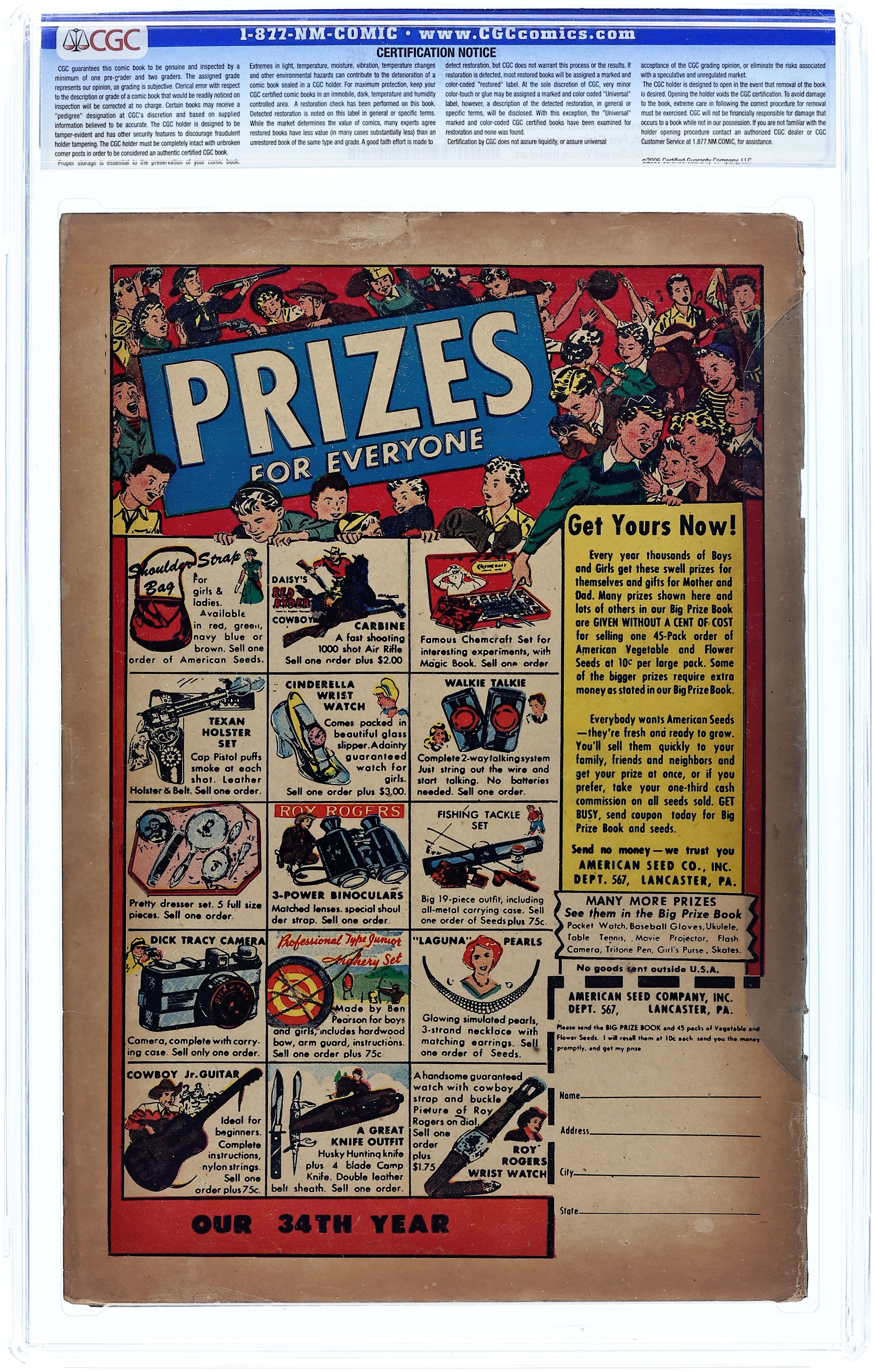 Cover pencils by Jack Kirby, inks by Dick Ayers. "The Scarecrow Walks!", pencils by Jack Kirby, inks by Dick Ayers; A landlord cheats poor farmers out of their land in order to sell it for nuclear tests; Radiation animates the farmers' abandoned scarecrow. "Mystery Trip," art by Joe Maneely; Tommy's uncle returns from a space journey needing to re-learn how to walk on earth instead of floating. "A Giant There Was!", art by Don Heck; A criminal steals beans that grow into a beanstalk leading to the land of giants; He tries to rob a castle, but he is caught and imprisoned with other criminals. "I Went Too Far Back!", art by Paul Reinman; A scientist's assistant travels to the past with a gun to rule a pre-technology world; Instead he finds that time is a loop, and when he travels back too far he finds himself a thousand years in the future. "The Thing in the Cell!", art by Steve Ditko; A corrupt police chief uses fines to fund a giant prison in order to increase his prestige; He jails a passerby for no reason, but is shocked to find that he is an alien leader. 36 pgs., full color. Cover price $0.10.