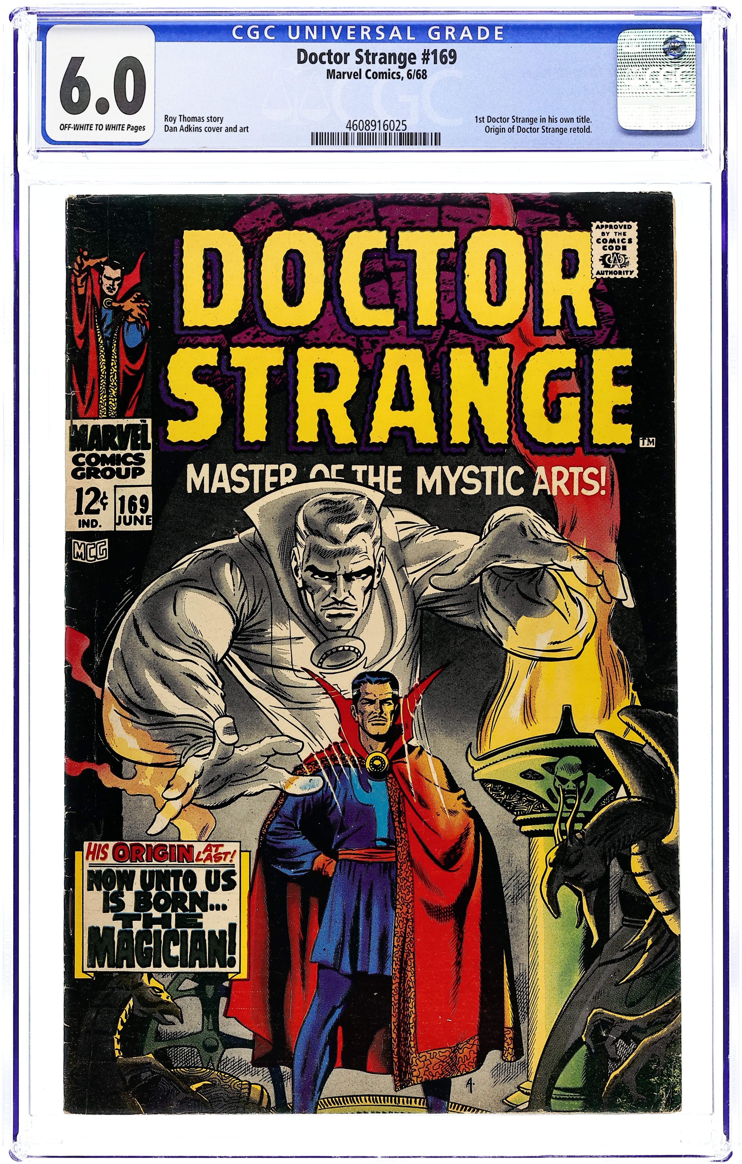 Doctor Strange stories continued from Strange Tales. 1st Doctor Strange in his own title. Cover art by Dan Adkins. The Coming of... Dr. Strange, script by Roy Thomas, art by Dan Adkins; Origin of Dr. Strange retold; Stephen Strange seeks out the Ancient One in Himalayas in hope of a cure for his damaged nerves; He discovers that Baron Mordo, a pupil of the Ancient One, is plotting to kill his teacher; Strange warns the Ancient One and then asks to study the mystic arts. House ad for Amazing Spider-Man #61 and Thor #152. Letter to the editor from comics historian George Olshevski. 36 pgs. $0.12. Cover price $0.12.