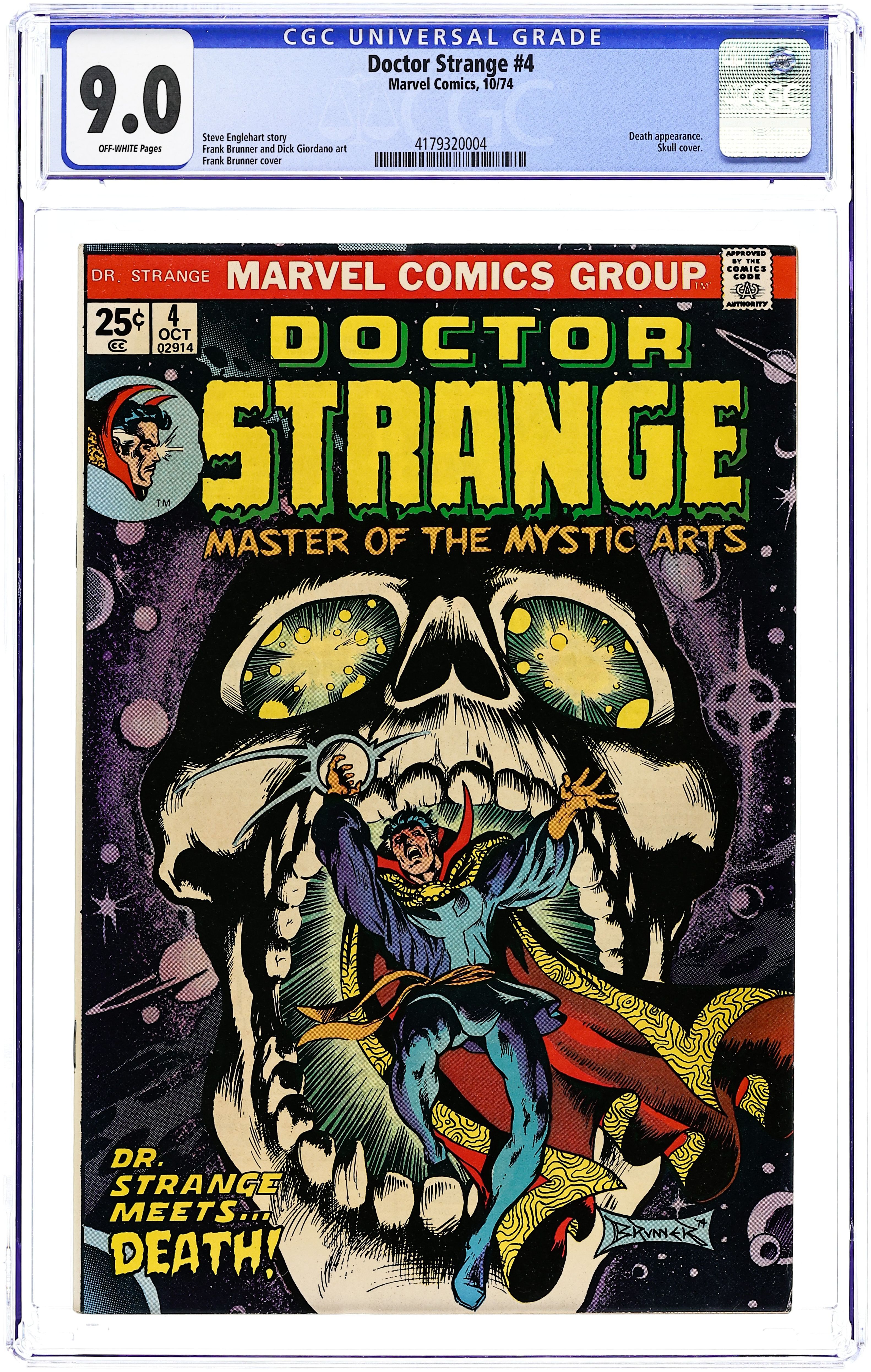 Cover art by Frank Brunner. ...Where Bound'ries...Decay, script by Steve Englehart (co-plot, script) and Frank Brunner (co-plot), pencils by Frank Brunner, inks by Dick Giordano and Bob Wiacek [as Crusty Bunkers]; Strange confronts Death, takes refuge inside form of Eternity. Strange fears Death no longer, & he Dies!!; Strange beholds Ancient One, who tells Strange he has won first in series of trials as Sorcerer Supreme; Ankh appears on Strange's forehead; Appearances by Clea, Eternity, and the Silver Dagger. The letters page contains Marvel Value Stamp series A #33 (Sue Richards, Invisible Girl; Jack Kirby art?). Cover price $0.25.