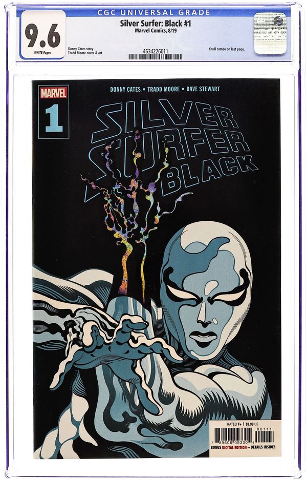 Written by Donny Cates. Art and Cover by Tradd Moore. Spinning out of GUARDIANS OF THE GALAXY #1, almost the entire galaxy's defenders have been blown through a black hole, including the Silver Surfer! But the story doesn't end there… In order to fight back the oblivion, Surfer will have to fight to save his own soul and not lose himself to the void. Follow the Sentinel of the Spaceways on a journey that will change him forever! From superstars Donny Cates (VENOM, GUARDIANS OF THE GALAXY) and Tradd Moore (ALL-NEW GHOST RIDER, VENOM)! 28 pages, full color. Rated T+ Cover price $3.99.